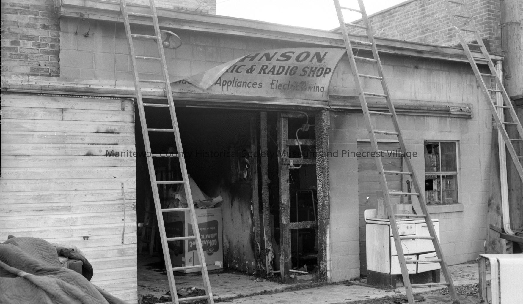 Johnson Electric, 908 Washington Street Manitowoc, back of building after fire. Photograph taken on October 15th, 1959.Made/Created