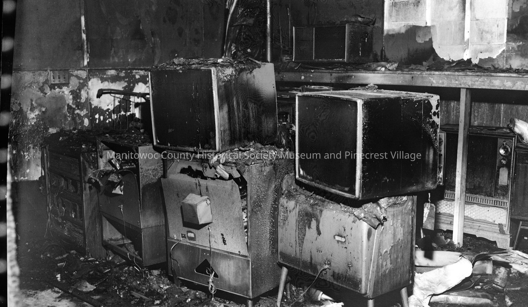 Johnson Electric, 908 Washington Street Manitowoc; downstairs TV repair shop after fire. Photograph taken on October 15th, 1959.Made/Created