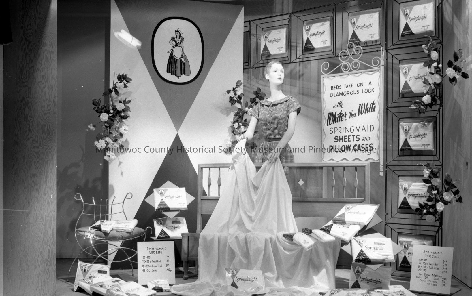 Johnson Hills store, 2 North 8th Street Manitowoc. Window display for linens. Photograph taken on August 5th, 1961.Made/Created
