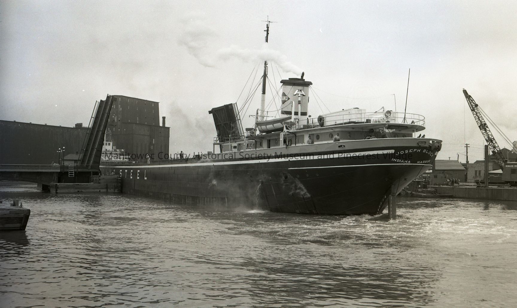 Joseph Block going up river through 10th Street bridge. Ahead is Elevator B. Photograph taken in 1961.