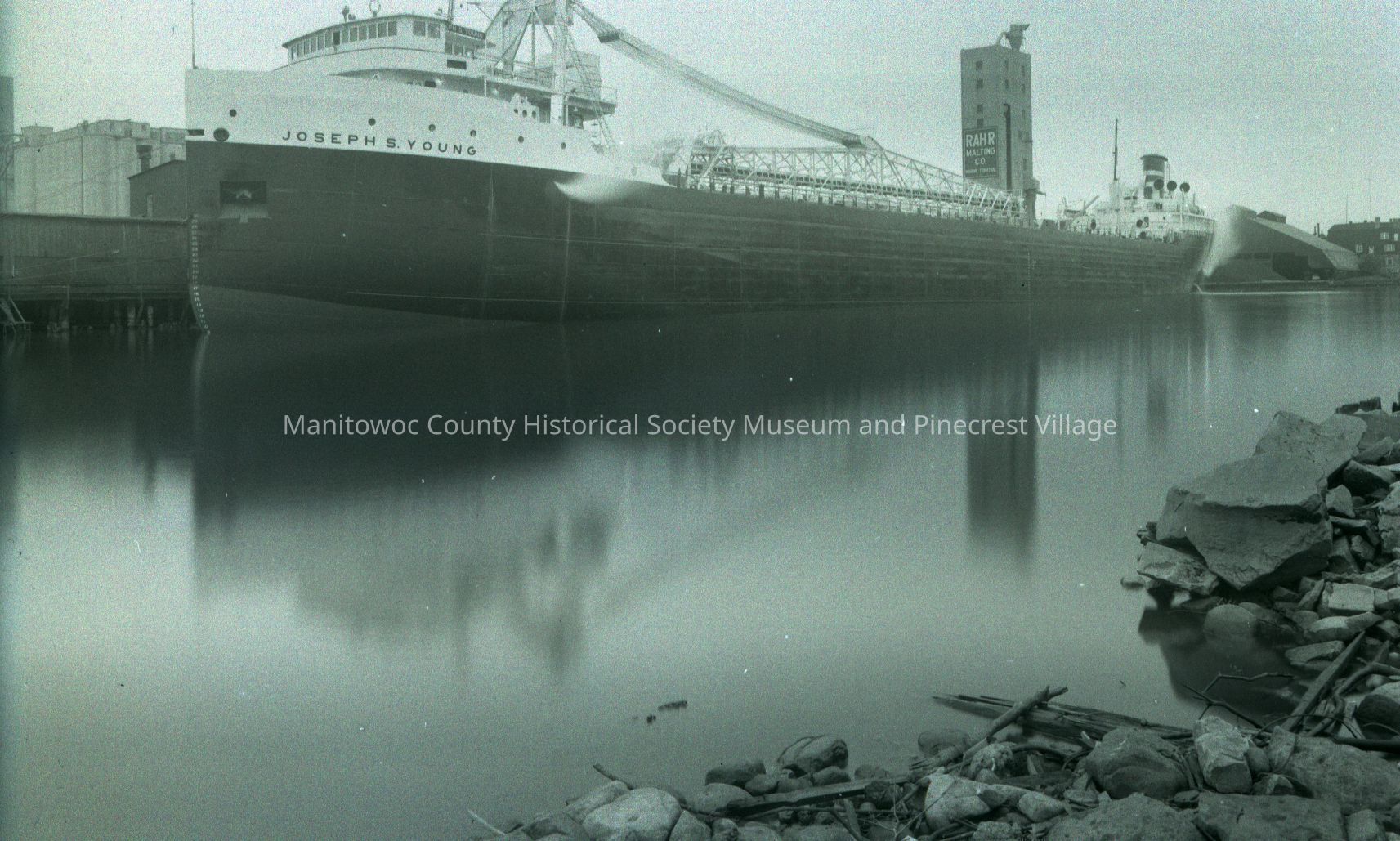 Joseph S. Young docked along Quay Street after getting self-unloader installed at Manitowoc Shipbuilding. Photograph taken in June 1957.Made/Created