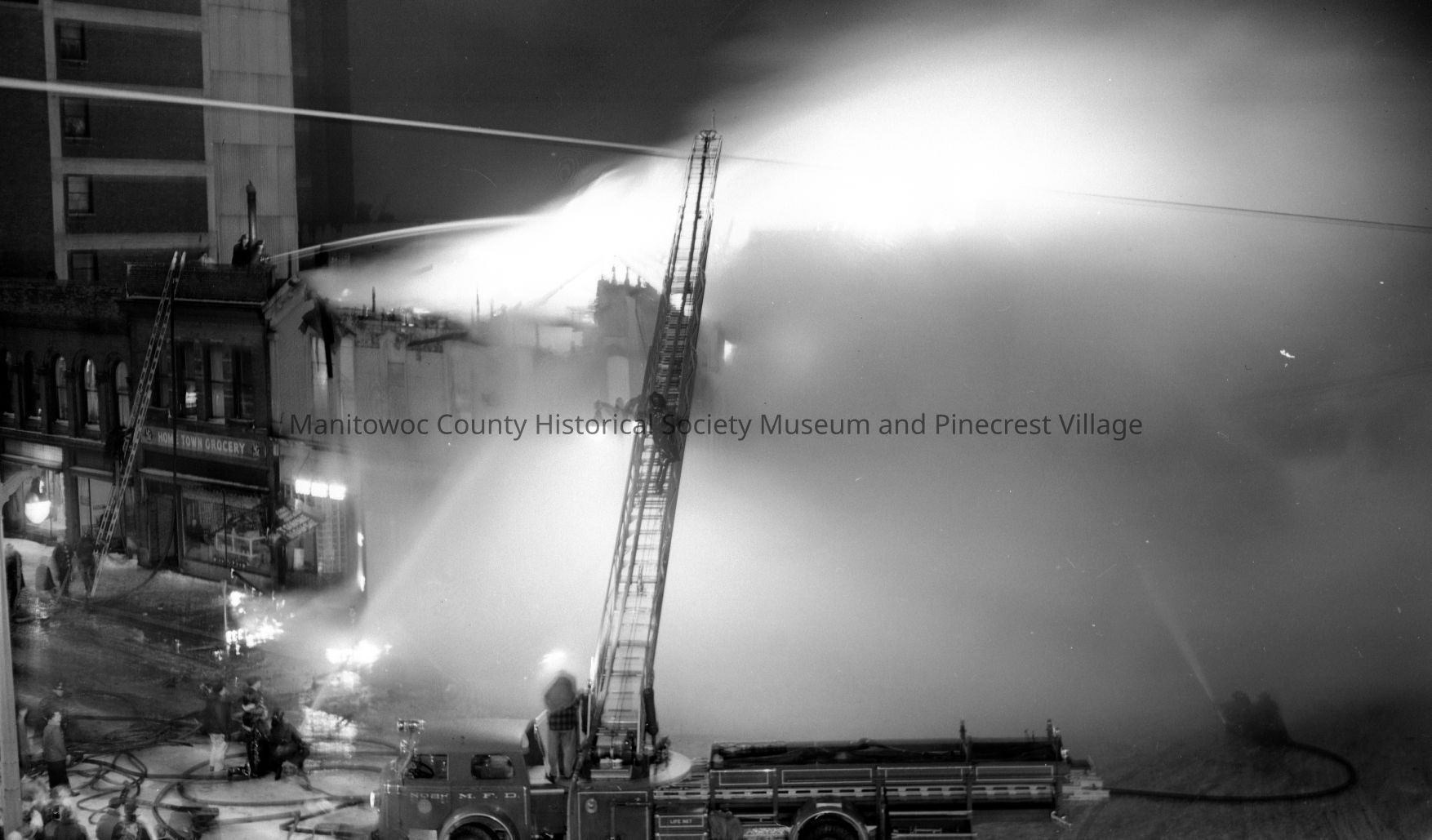 Kapitan Building fire, southwest corner of North 8th & Buffalo Street Manitowoc. Left of the building is the Hometown Grocery, 212 and Chermak Meat Market, 210 North 8th. Photo taken from Westphal's Hardware, 301 North 8th Street. Photograph taken on February 10th, 1953.Made/Created