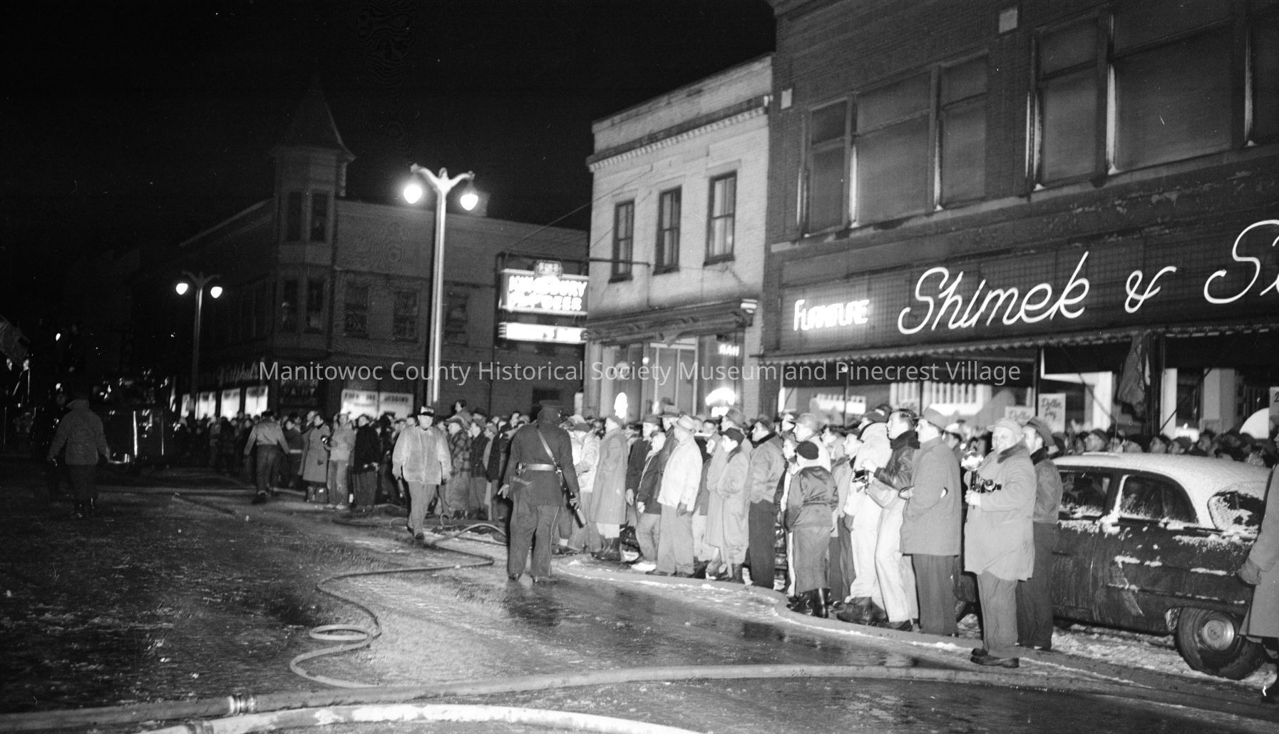 Crowd watching Kapitan Building fire from across the street on north 8th. Buildings behind are Shimek & Schwartz Furniture, 211 and Tony's Bar, 215 North 8th Street Manitowoc. Photograph taken on February 10th, 1953.Made/Created