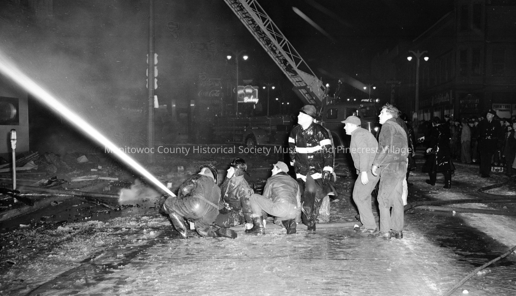 Firefighters using 2 1/2" ground line at Kapitan Building fire, north 8th Street Manitowoc. Photograph taken on February 10th, 1953.Made/Created