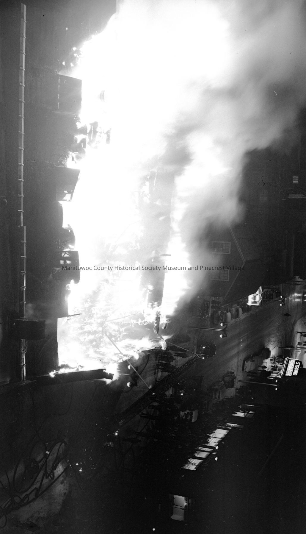 Kapitan Building fire looking north from the Hotel Manitowoc. In the distance at right is Westphal's Hardware, 301; Strand Theatre, 315; Krall's Texaco Station, 401; and the Opera House, 411 North 8th Street. Photograph taken on February 10th, 1953.Made/Created