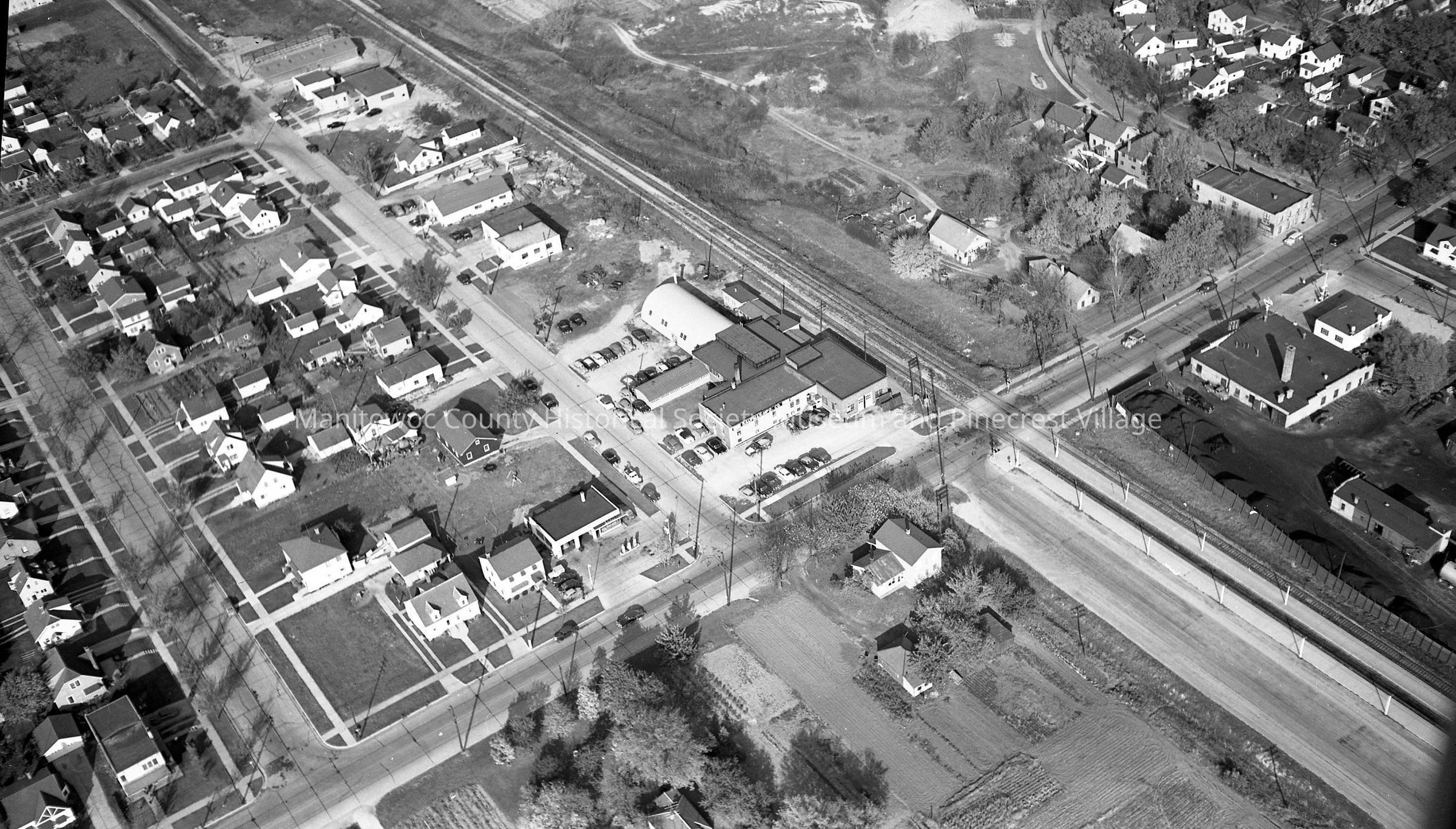 Aerial of Kaufman Mfg., 547 South 29th Street Manitowoc. Across street is Rod's Shell gas station, 2902 Meadow Lane and at right center is Brewer Furniture, 2802; Johnnie's Standard gas station, 2801; and Streich Oil & Coal Company, 2813 Meadow Lane. Photograph taken in 1954.Made/Created