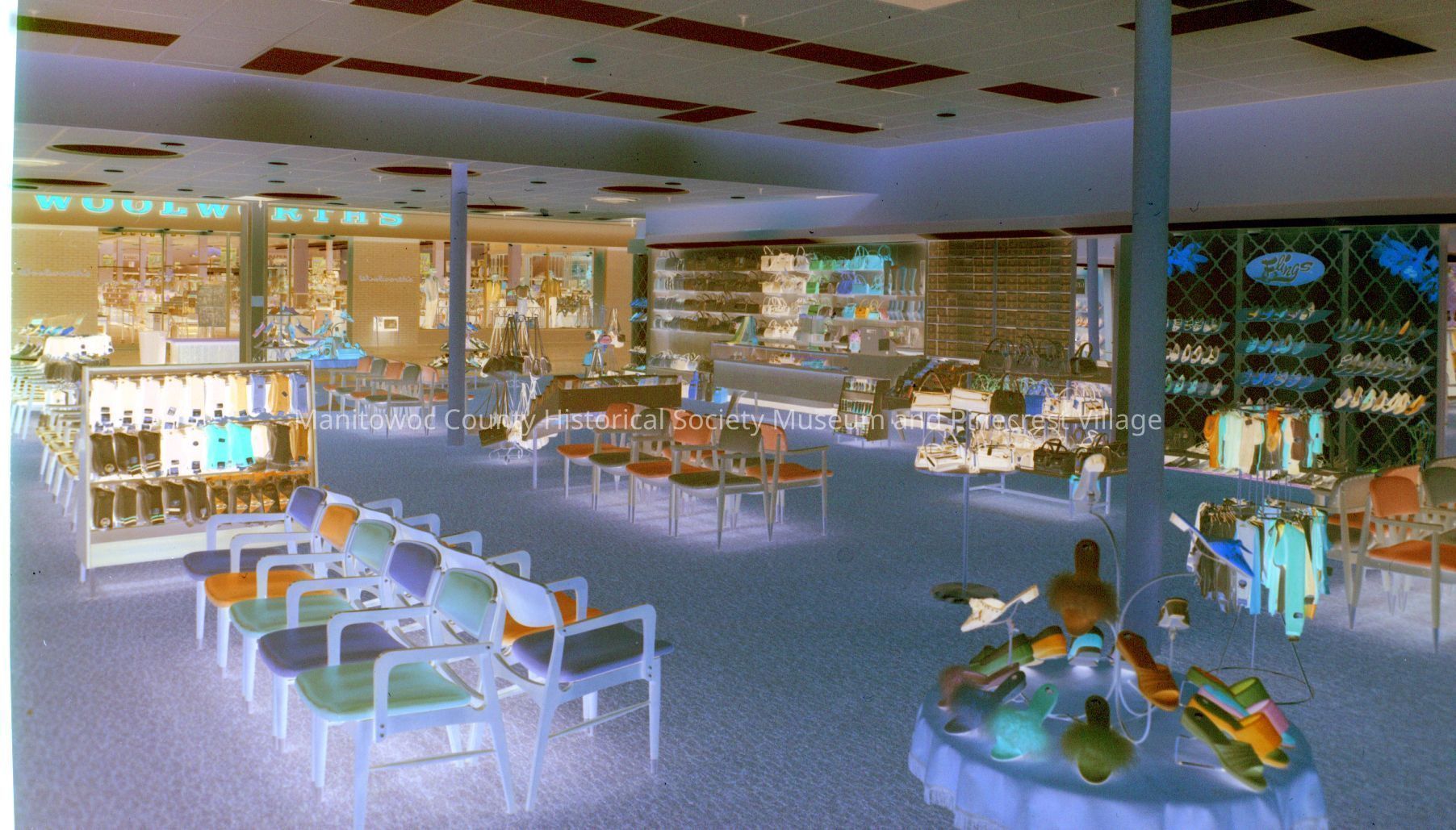 New Kinney Shoe store at Mid-Cities Mall, 828 Memorial Drive Manitowoc. Looking at main floor toward front entrance. Photograph taken in May 1968.Made/Created