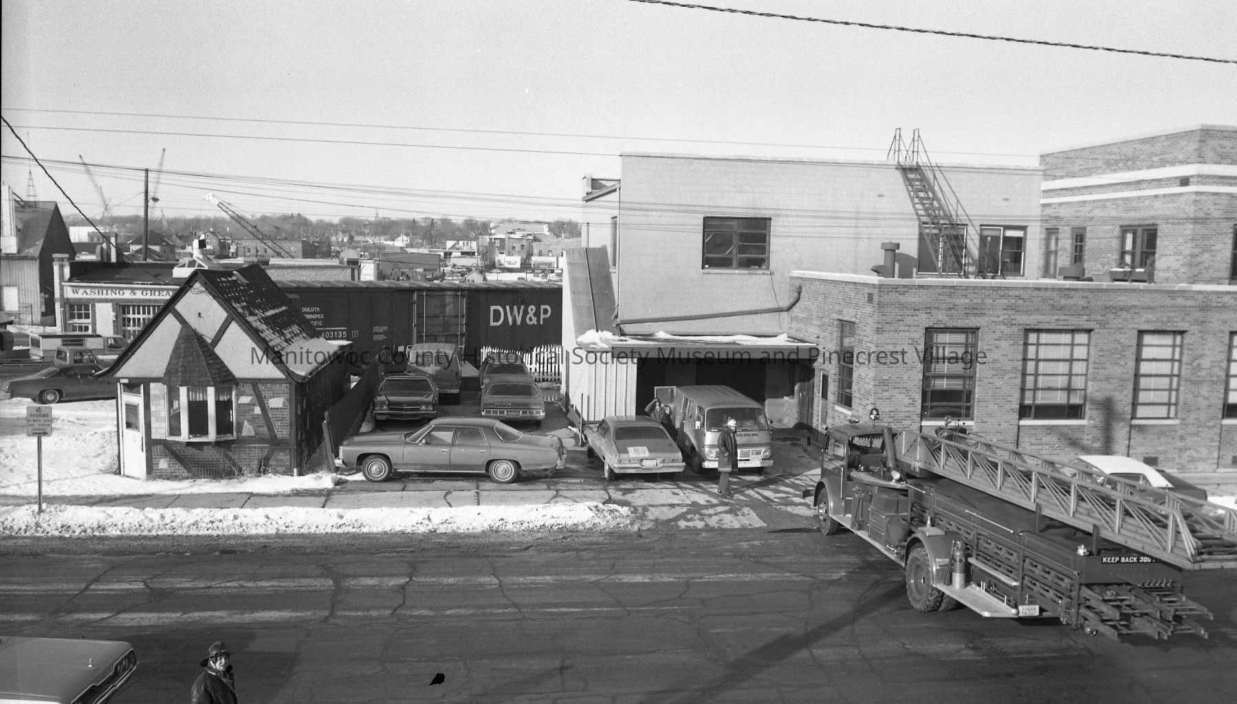 LaFrance aerial truck backing into Station #1 in downtown Manitowoc. At left is Midget Cafe and center the Herald Times office. Photograph taken on February 12th, 1975.Made/Created