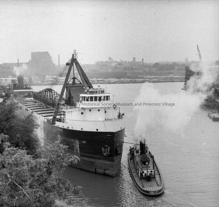 Boat: Lake boat J. L. Reiss being turned at Manitowoc Shipbuilding. She is empty so it may have just unloaded at Manitowoc Portland Cement Company. Photograph taken in August 1958.Made/Created