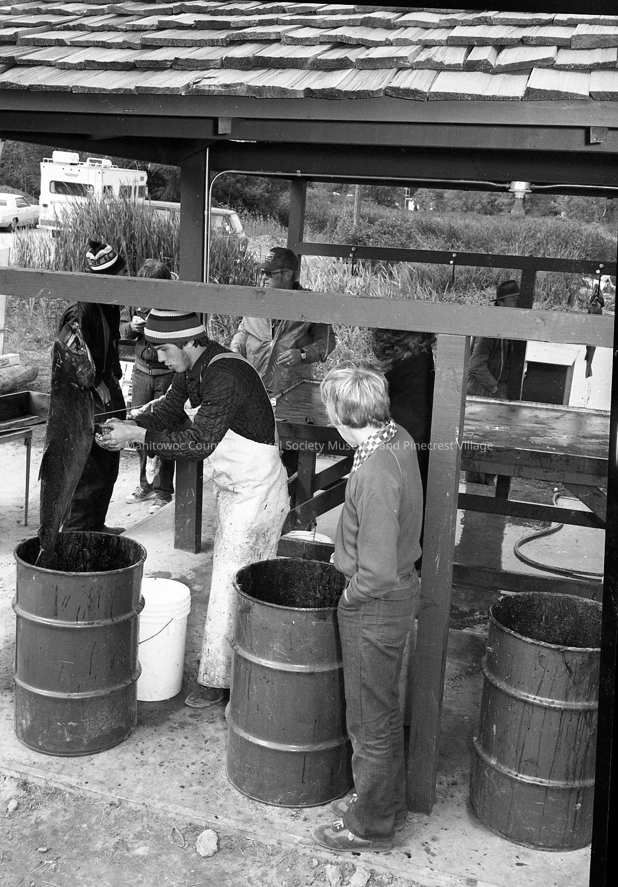 Snagging Season along Lake Michigan near Little Manitowoc river: gutting salmon at cleaning station