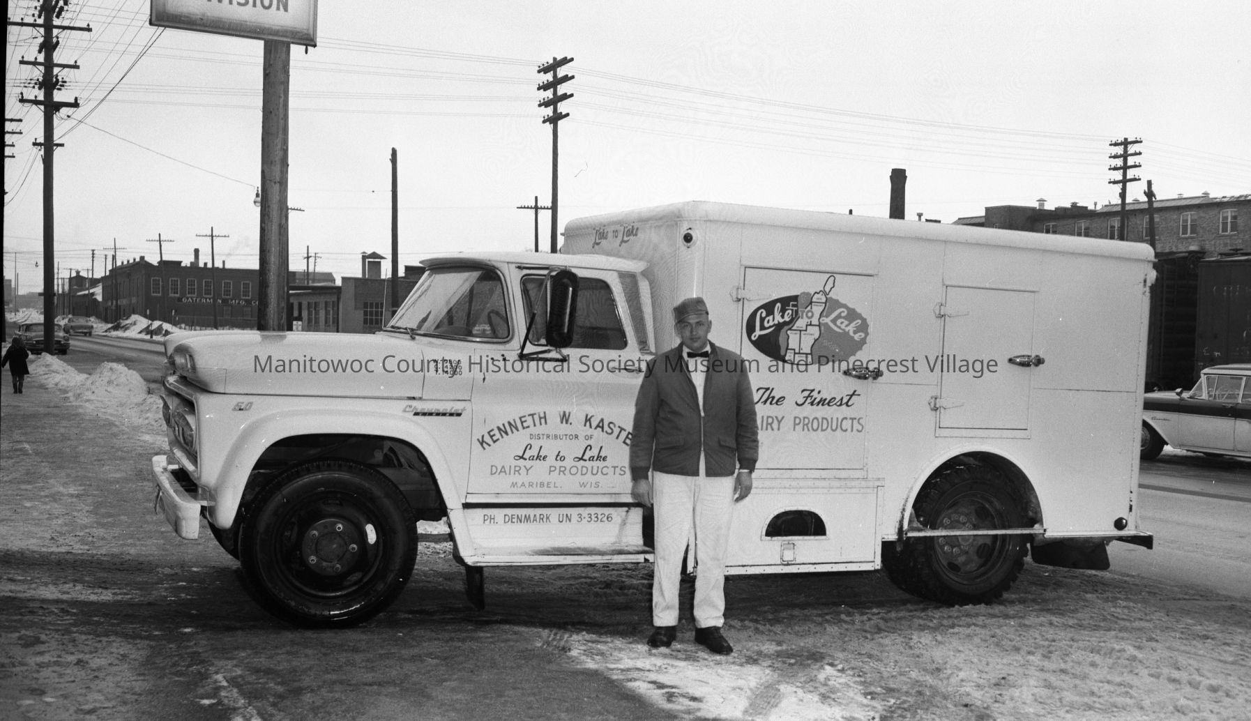 Lake to Lake new truck for Kenneth Kasten, distributor of Maribel, parked at Lauson Chevrolet, Franklin Street Manitowoc. In background is Gaterman Mfg., 836 South 15th Street. Photograph taken on February 15th 1962.Made/Created