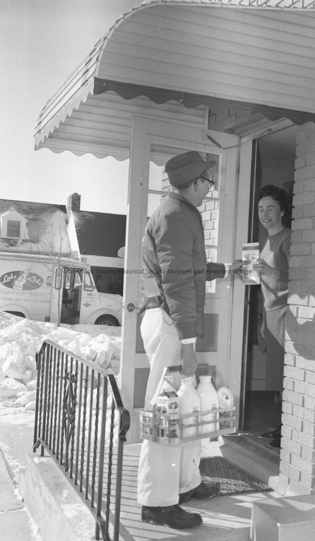 Lake to Lake Dairy milkman making a house delivery in Manitowoc. Photograph taken on January 31st, 1963.