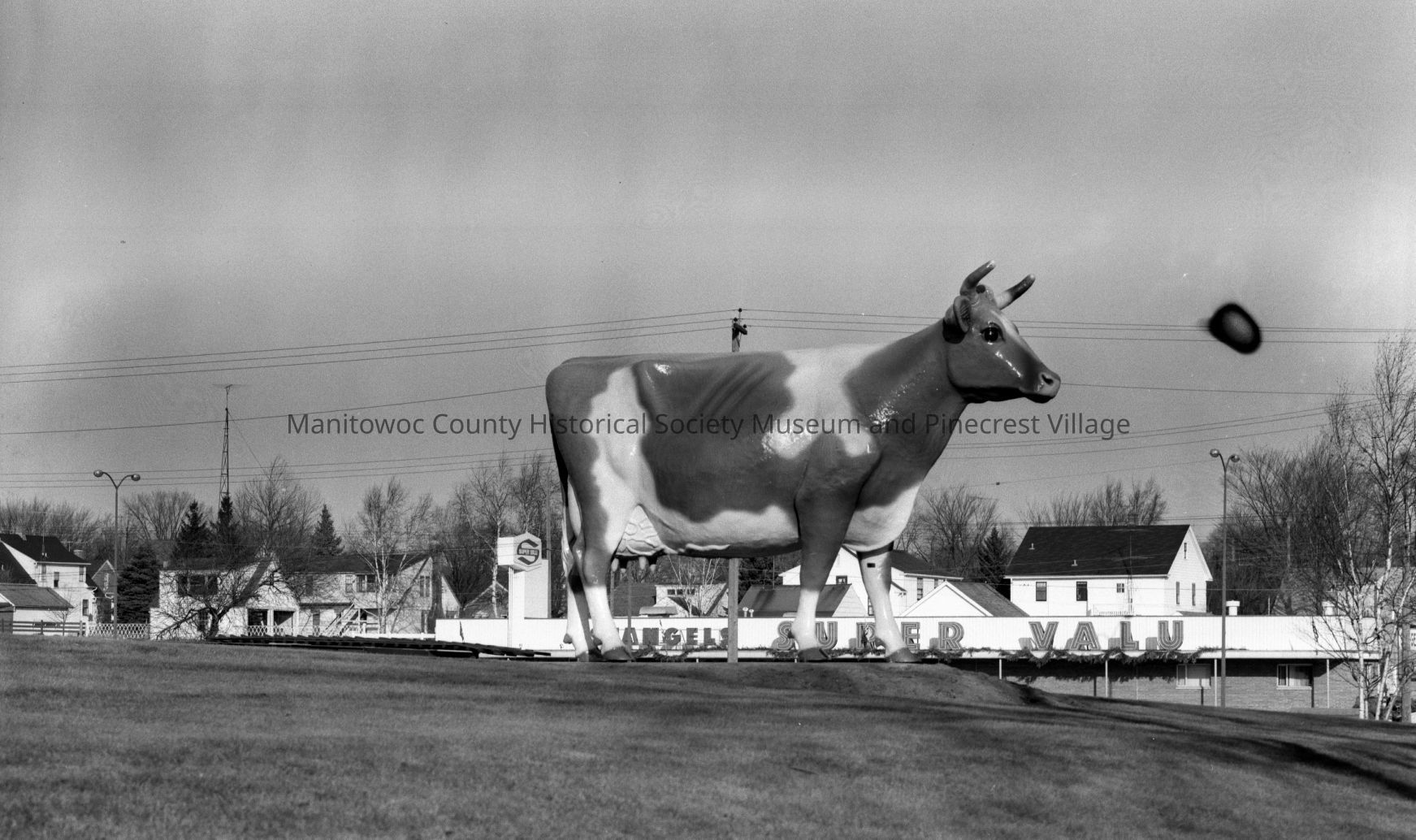 Lake to Lake Dairy cow, 2000 South 10th Street Manitowoc. In background is Stangel Super Value, 1920 South 10th and homes on 1000 block of Grand Ave. Photograph taken on December 11th, 1966.Made/Created