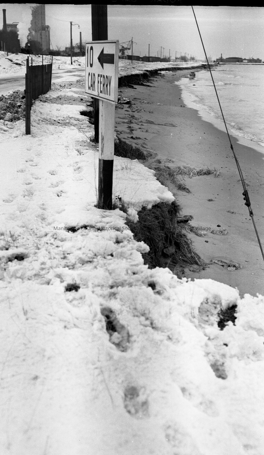 Lakefront erosion at east end of Columbus Street & HWY 10 to carferry slip Manitowoc. Looking north towards sewage treatment plant. Photograph taken on November 8th, 1951.Made/Created
