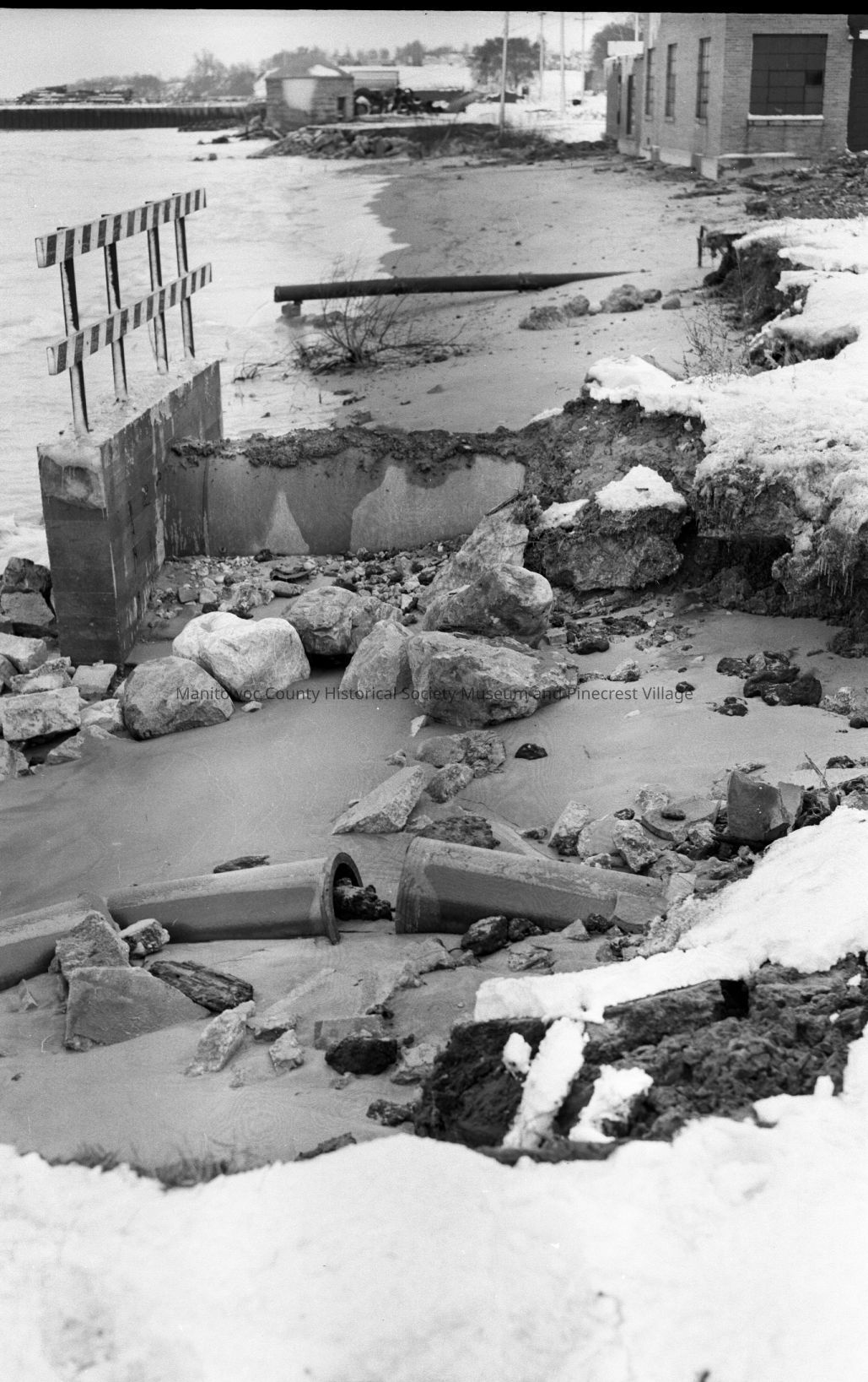 Lakefront erosion at east end of Columbus Street Manitowoc. Looking south at Public Utilities warm water discharge. Photograph taken on November 8th, 1951.Made/Created