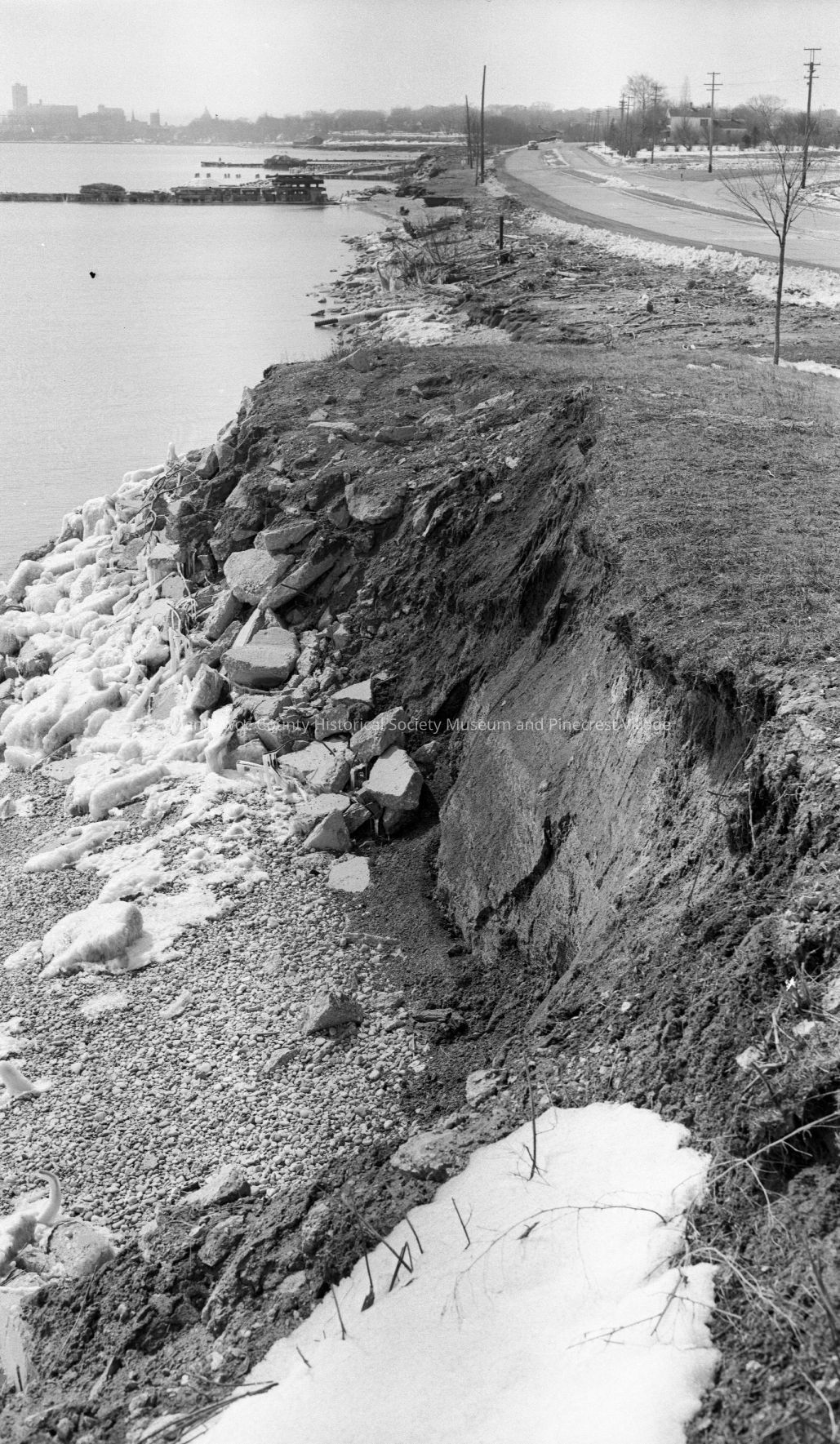 Lakefront erosion looking south at Cleveland Ave and Waldo Blvd intersection Manitowoc. Photograph taken on March 26th, 1956.Made/Created