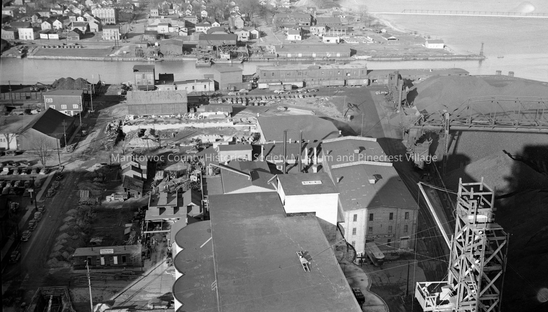 Lakeside Packing Company, 508 Jay Street Manitowoc looking down from Rahr Malting. At right is the C. Reiss coal docks; in background at water's edge is Pauly Cheese Company on Quay Street. Across river is Commercial Street and the old Goodrich Transportation Company dock and Freight House. Photograph taken on December 10th, 1946.Made/Created