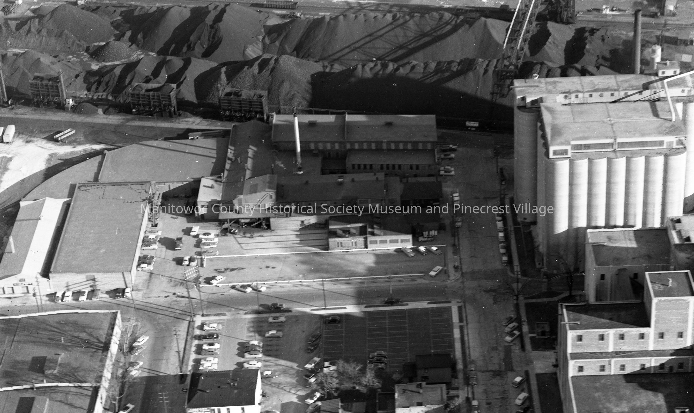 Aerial view of the Lakeside Packing Plant, 508 Jay Street Manitowoc. At top is C. Reiss Coalyard and at right is Rahr Malting Company. Building center bottom is Lakeside Hotel & Bar, 611 Freanklin Street. Photograph taken on December 1st, 1958.Made/Created