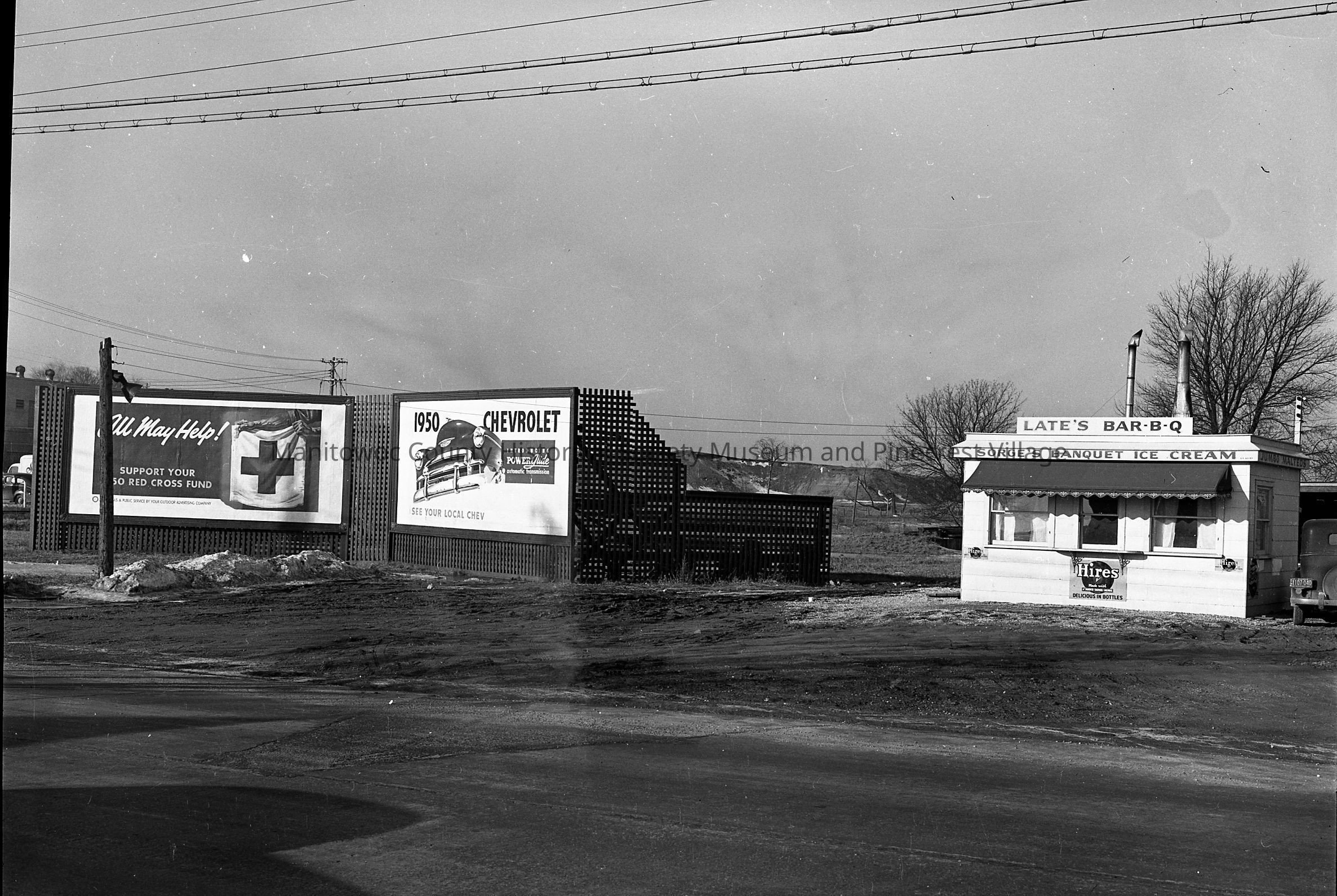 Aerial of Late's Bar-B-Que, 920 South 10th Street Manitowoc before moved to South 9th Street. At left edge is Sorge Dairy, 2000 South 10th Street. Photograph taken on March 6th, 1950.Made/Created