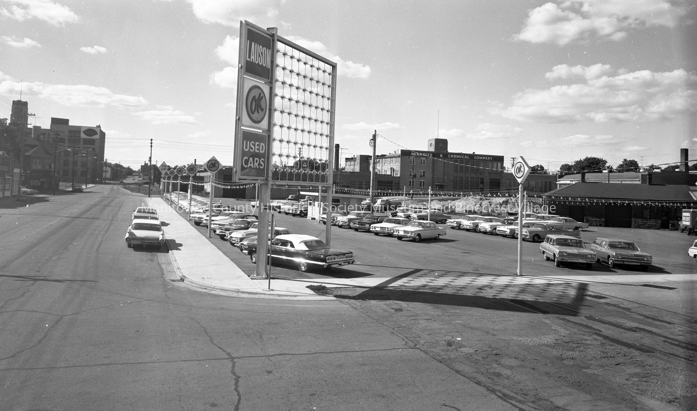 Lauson Chevrolet 'Used Car' lot at corner of South 13th and Franklin Street Manitowoc. In background is Heresite Chemical Company, 822 South 14th and at left is JonesTire, 1315 Franklin and Schneider's Bar, 902 South 14th Street. Circa 1966.Made/Created