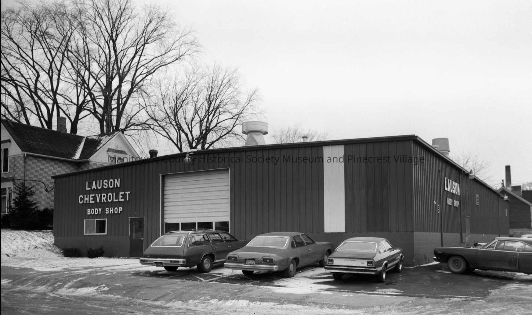 Lauson Chevrolet body shop on South 13th Street. At left is 902 South 13th Street Manitowoc. Photograph taken in 1975.