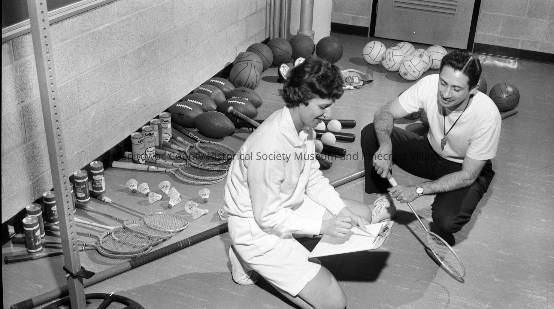 Lincoln High School, South 8th Street Manitowoc, physical education teachers Joan Oriatt and Ned Hodgson looking over equipment. Photograph taken on May 2nd, 1963.Made/Created