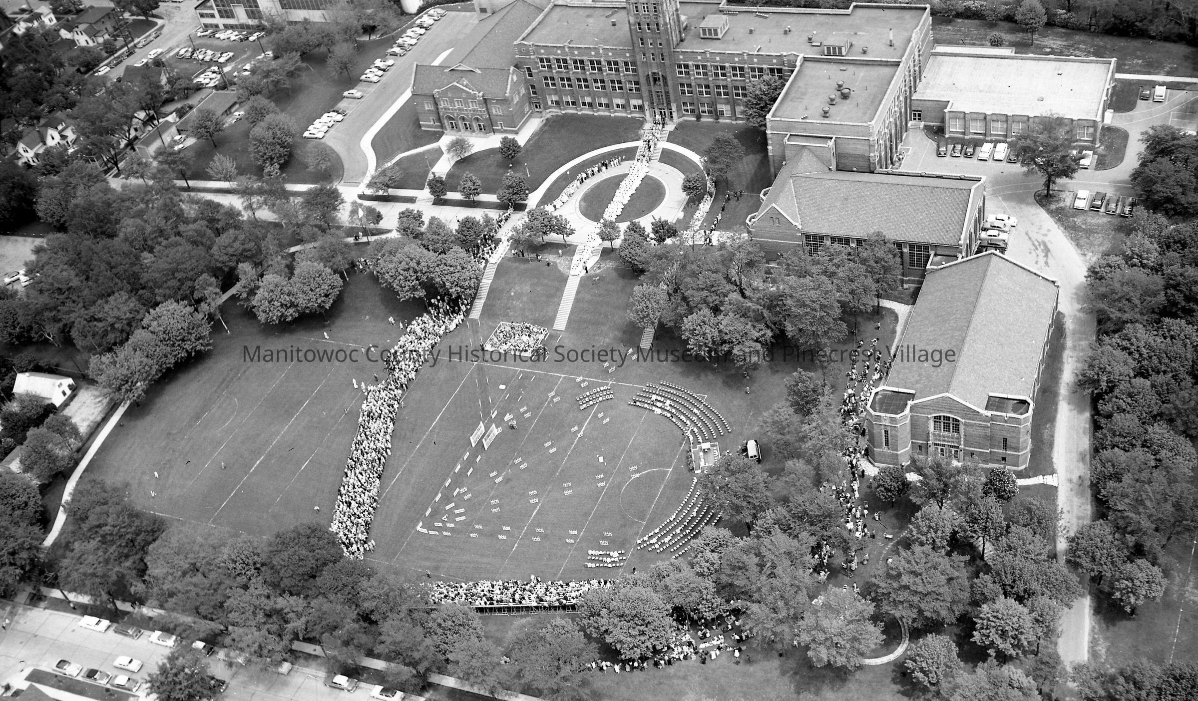 Aerial of Lincoln High School, 1433 South 8th Street Manitowoc; 1957 graduation with flower girls about to descend the steps with students behind in circle. Photograph taken on June 5th, 1957.Made/Created