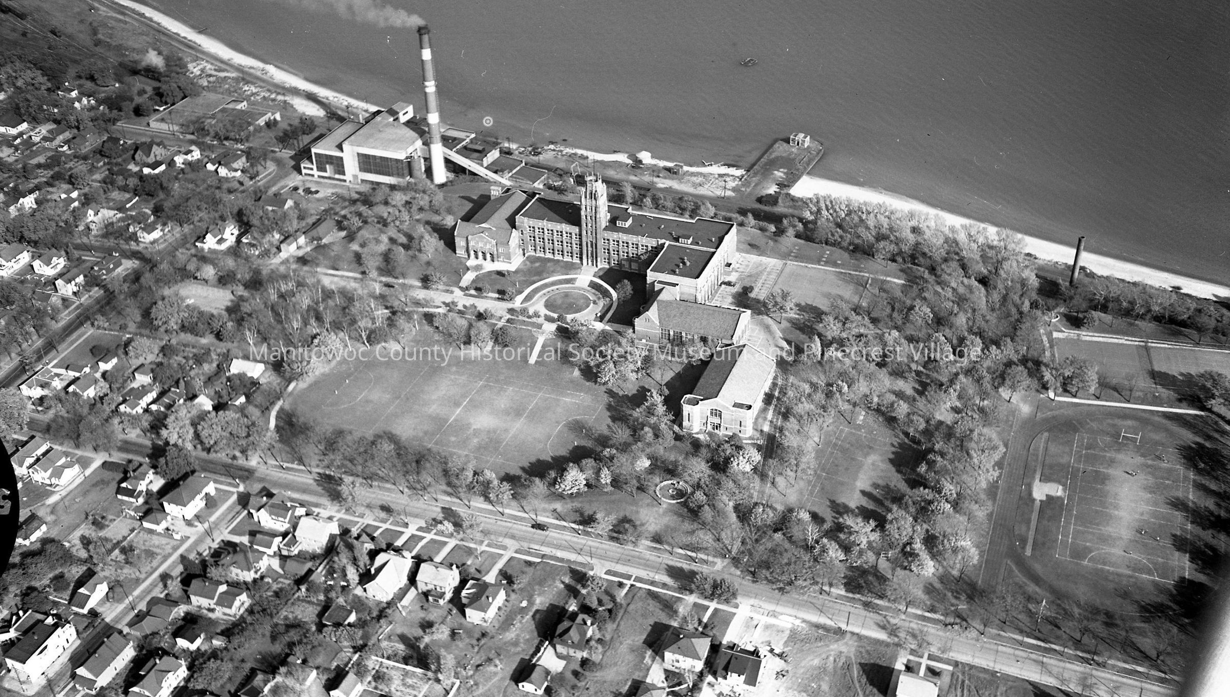Aerial of Lincoln High School, 1433 South 8th Street Manitowoc. At left corner of school is Manitowoc Public Utilities, 621 Columbus Street. At right edge are the tennis courts and track area. Photograph taken in 1954.Made/Created