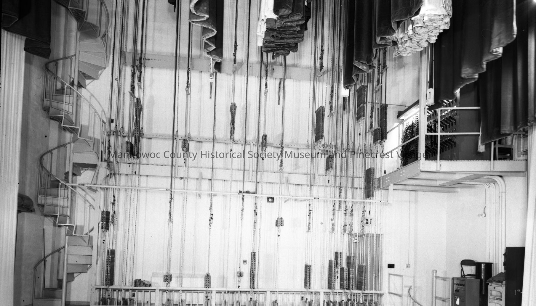 Lincoln High School, South 8th Street Manitowoc, ropes & curtains back stage auditorium. Photograph taken on December 24th, 1956.Made/Created