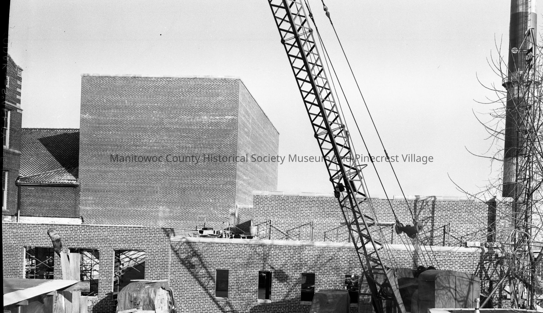 Lincoln High School, South 8th Street Manitowoc. Work almost done on outside addition of band, chorus rooms in auditorium. Photograph taken on January 21st, 1956.Made/Created