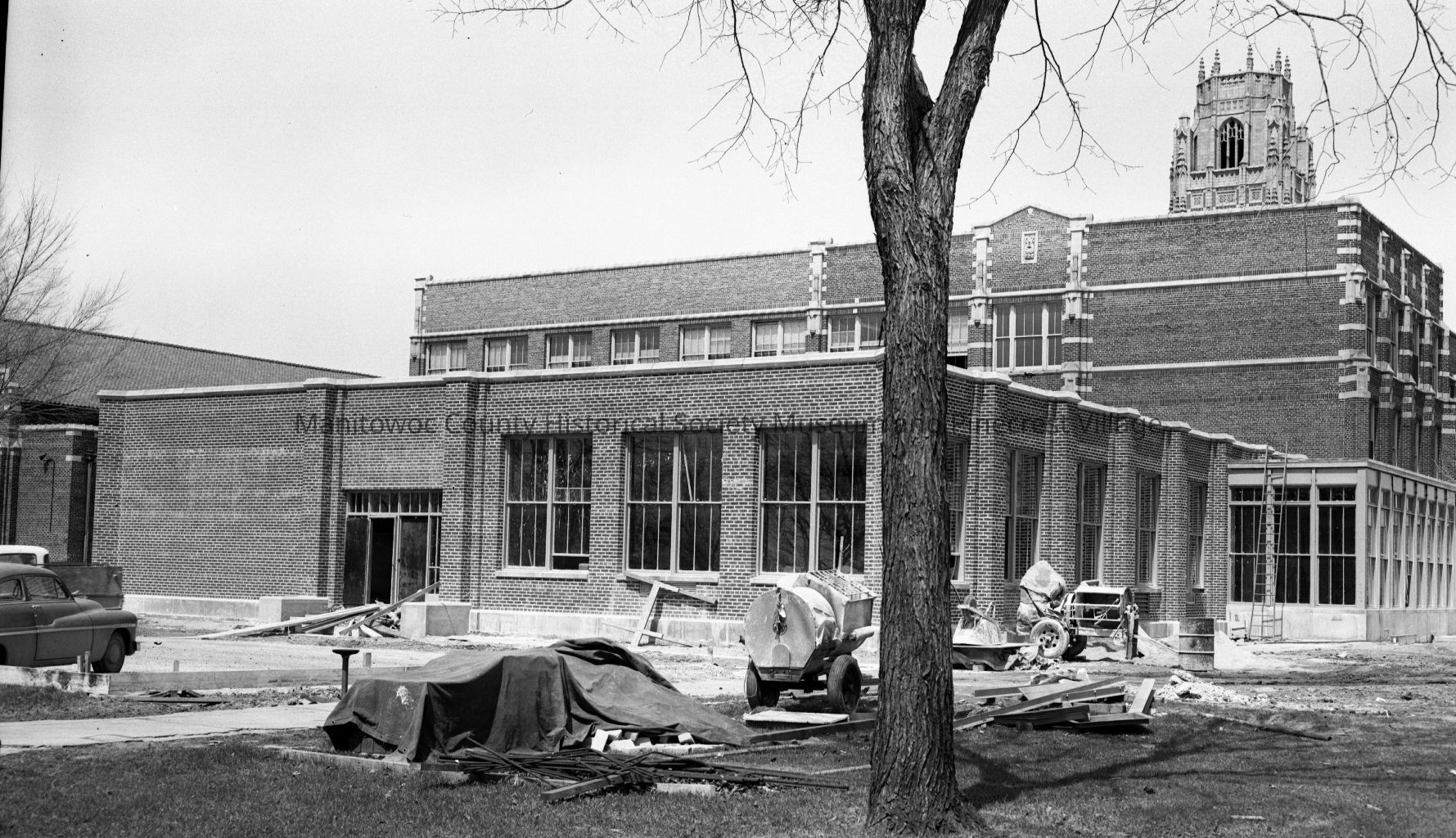Lincoln High School, South 8th Street Manitowoc, library & cafeteria addition on south end nearing completion. Photograph taken on May 1st, 1956.Made/Created
