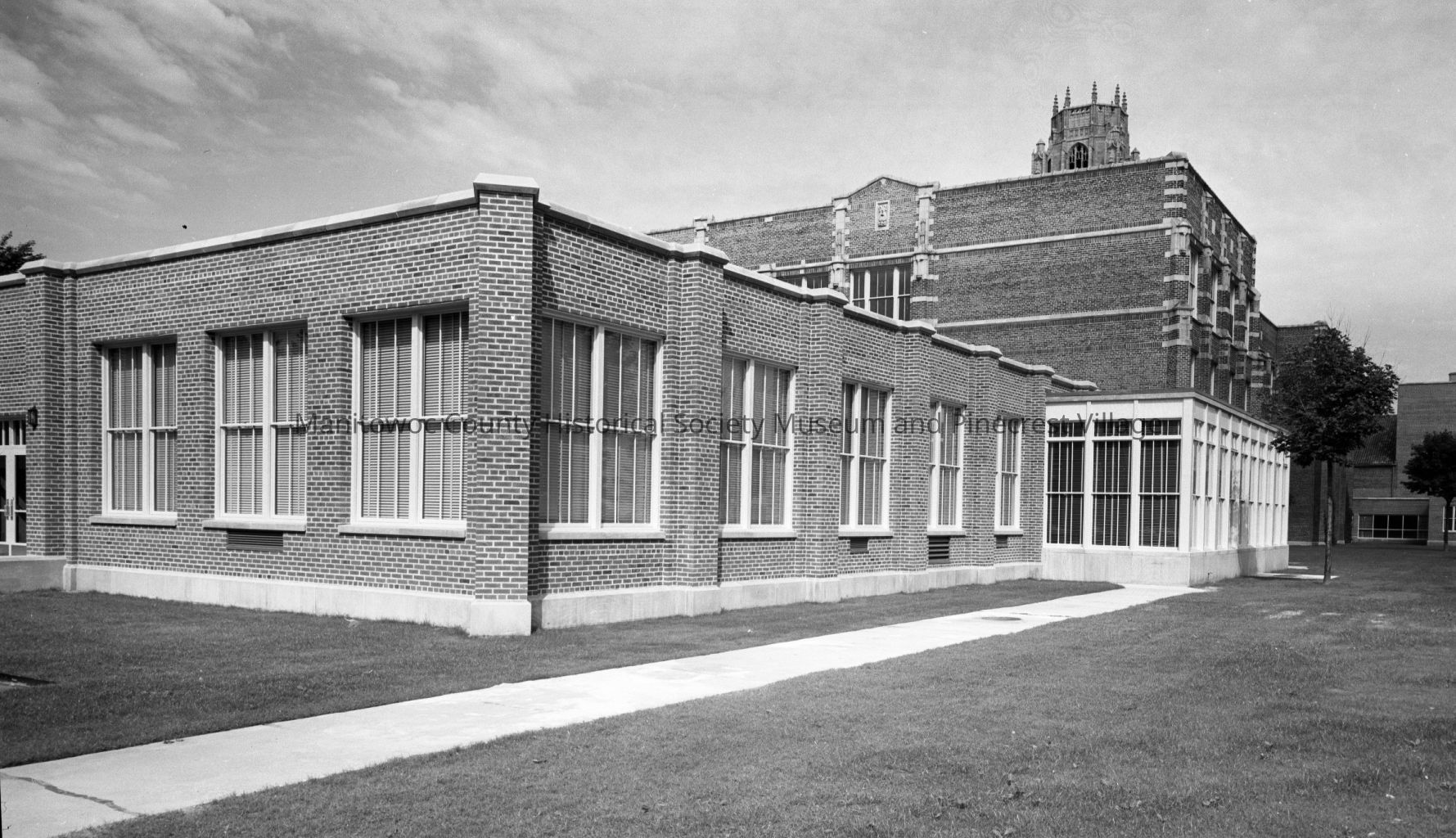 Lincoln High School, South 8th Street Manitowoc, library & cafeteria addition and at right is auditorium & music room addition. Photograph taken on June 1956.Made/Created