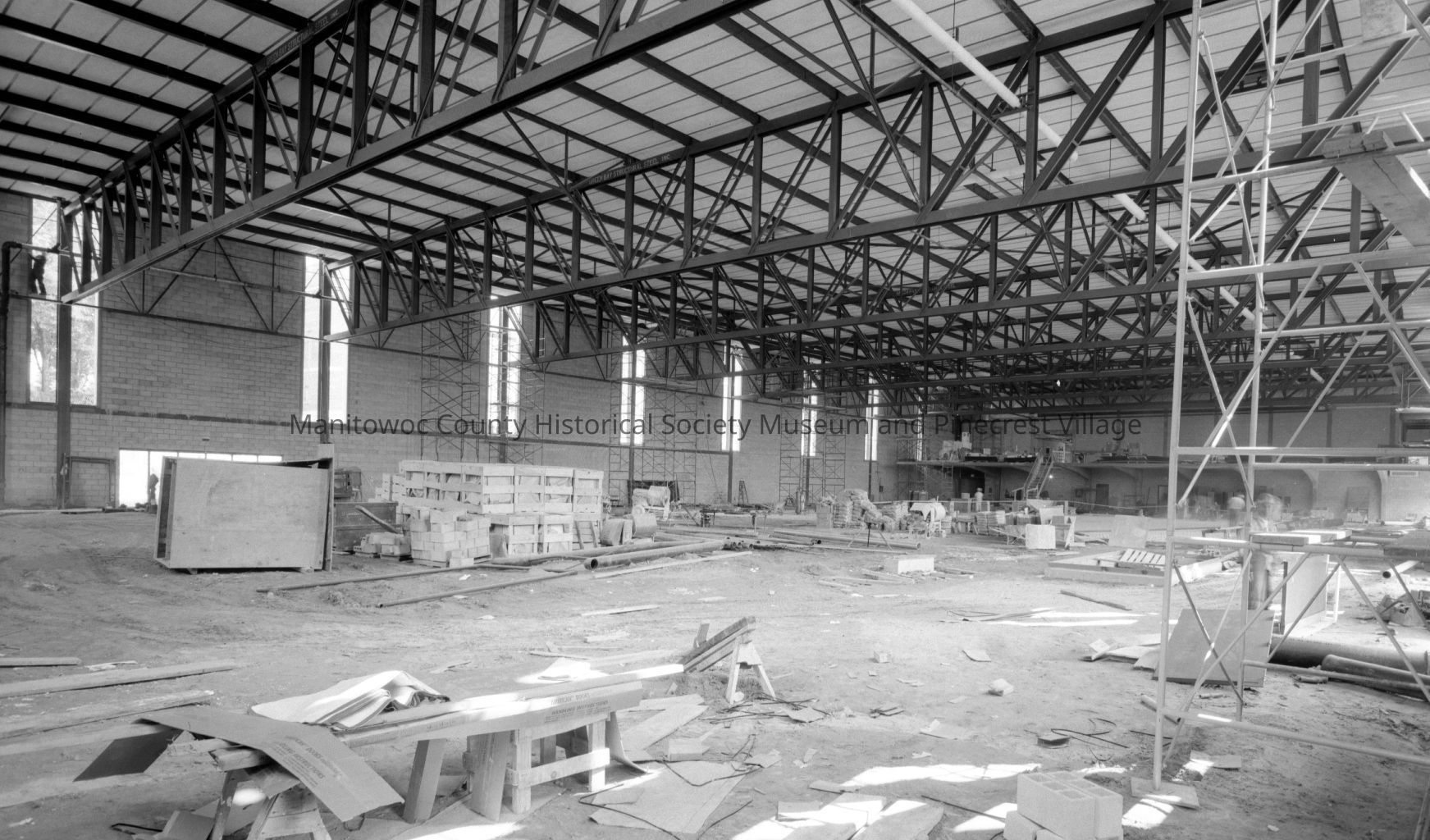 Lincoln High School, South 8th Street Manitowoc, interior construction on new gym, looking east with balcony at center right. Photograph taken in July 1961.Made/Created