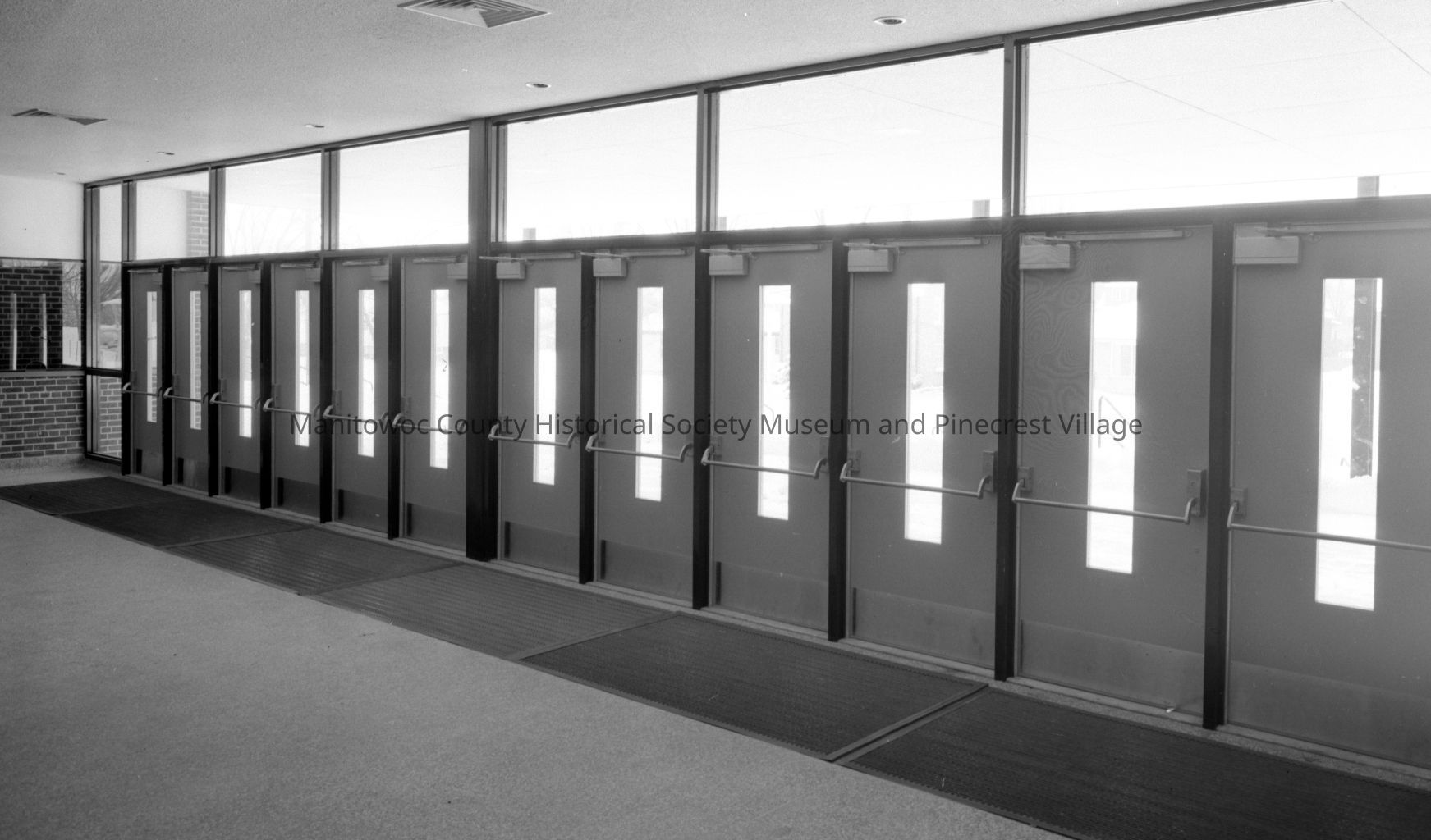 Lincoln High School, South 8th Street Manitowoc, outside front entrance to new gym. At left is ticket booth. Photograph taken on December 7th, 1961.Made/Created