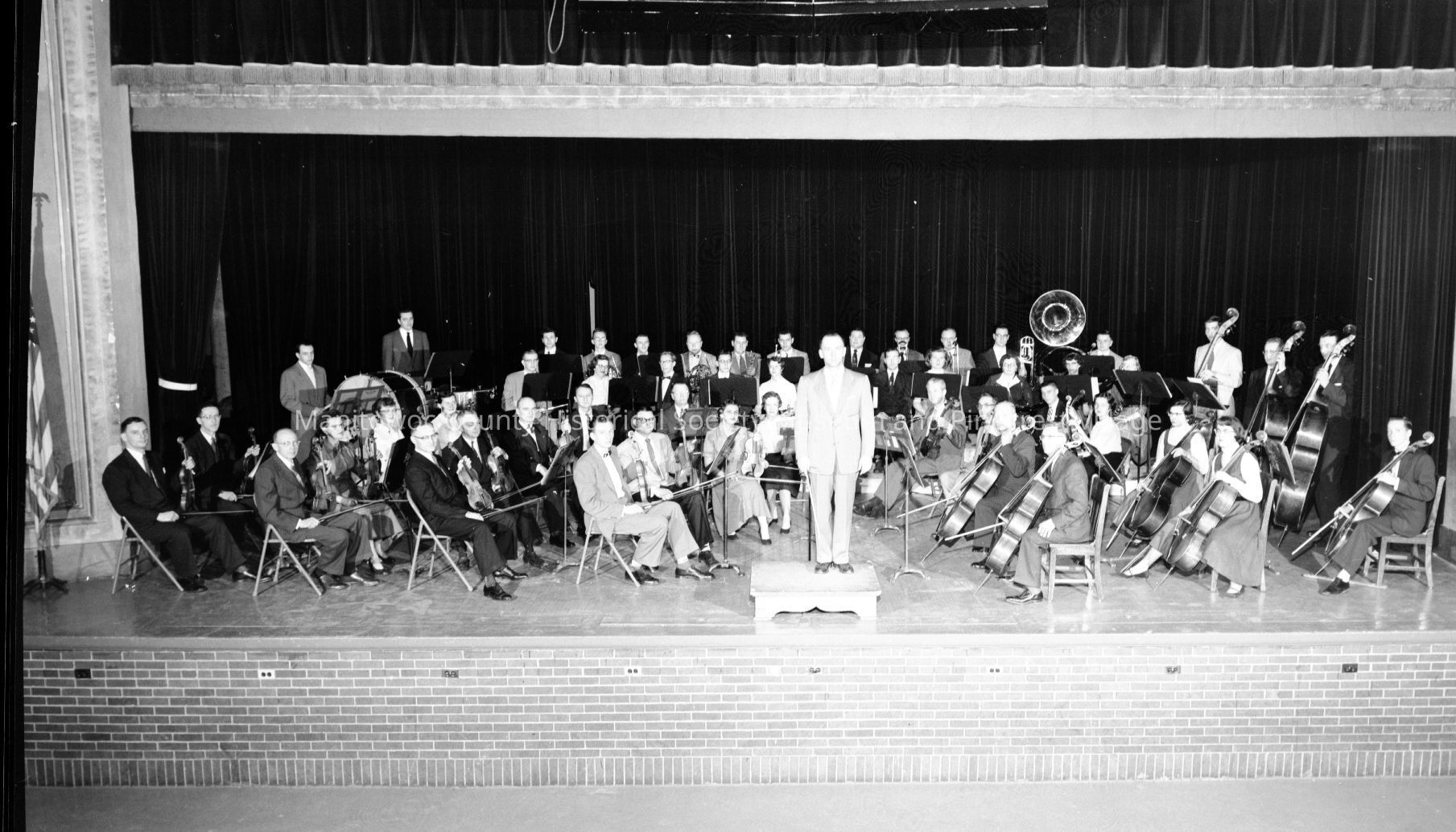Lincoln High School, South 8th Street Manitowoc, orchestra on stage led by Don Pankratz. Photograph taken on February 20th, 1955.Made/Created