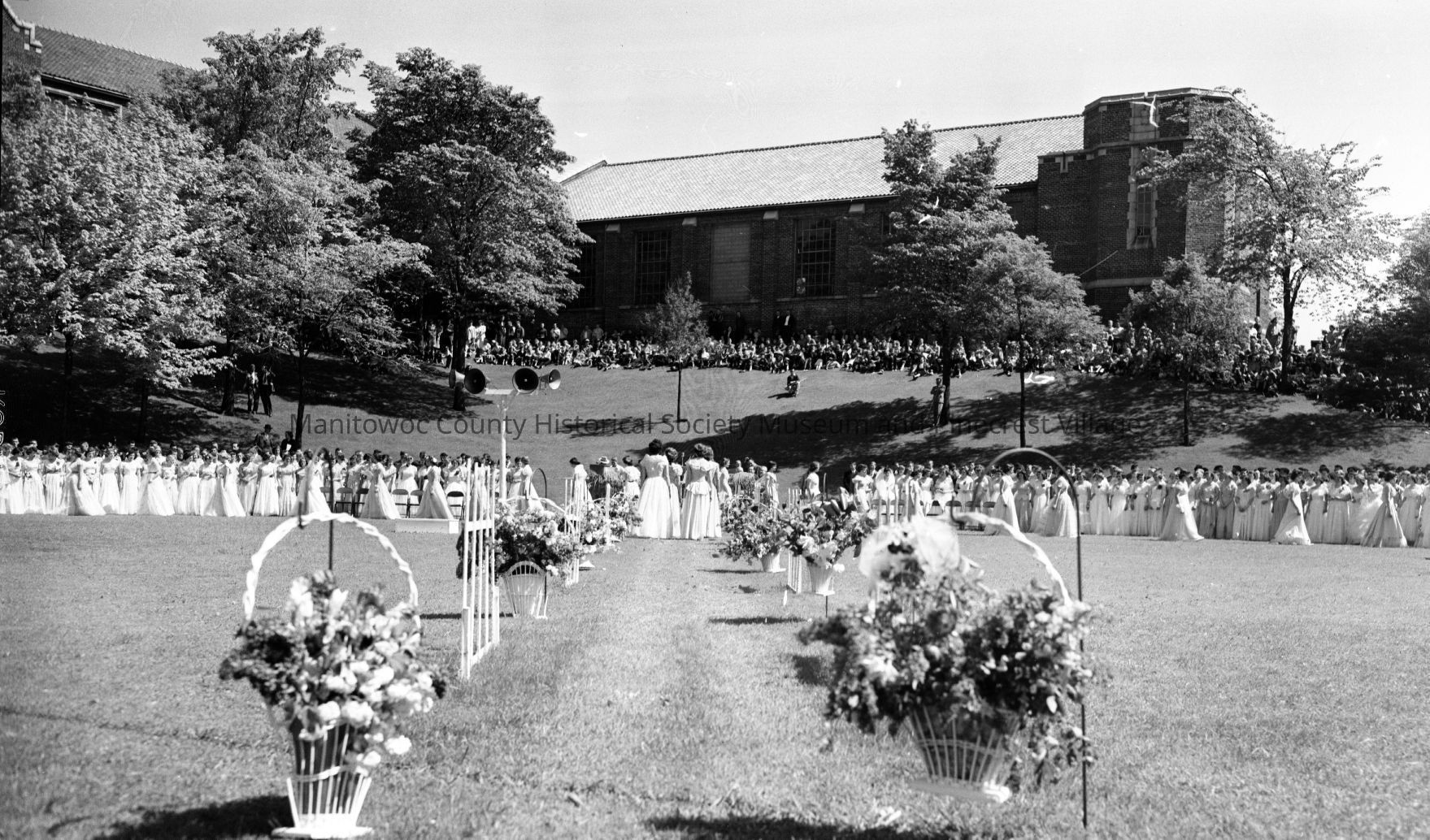 Lincoln High School, South 8th Street Manitowoc, crowd watching graduation from hill above bowl by natatorium. Photograph taken on June 6th, 1951.Made/Created