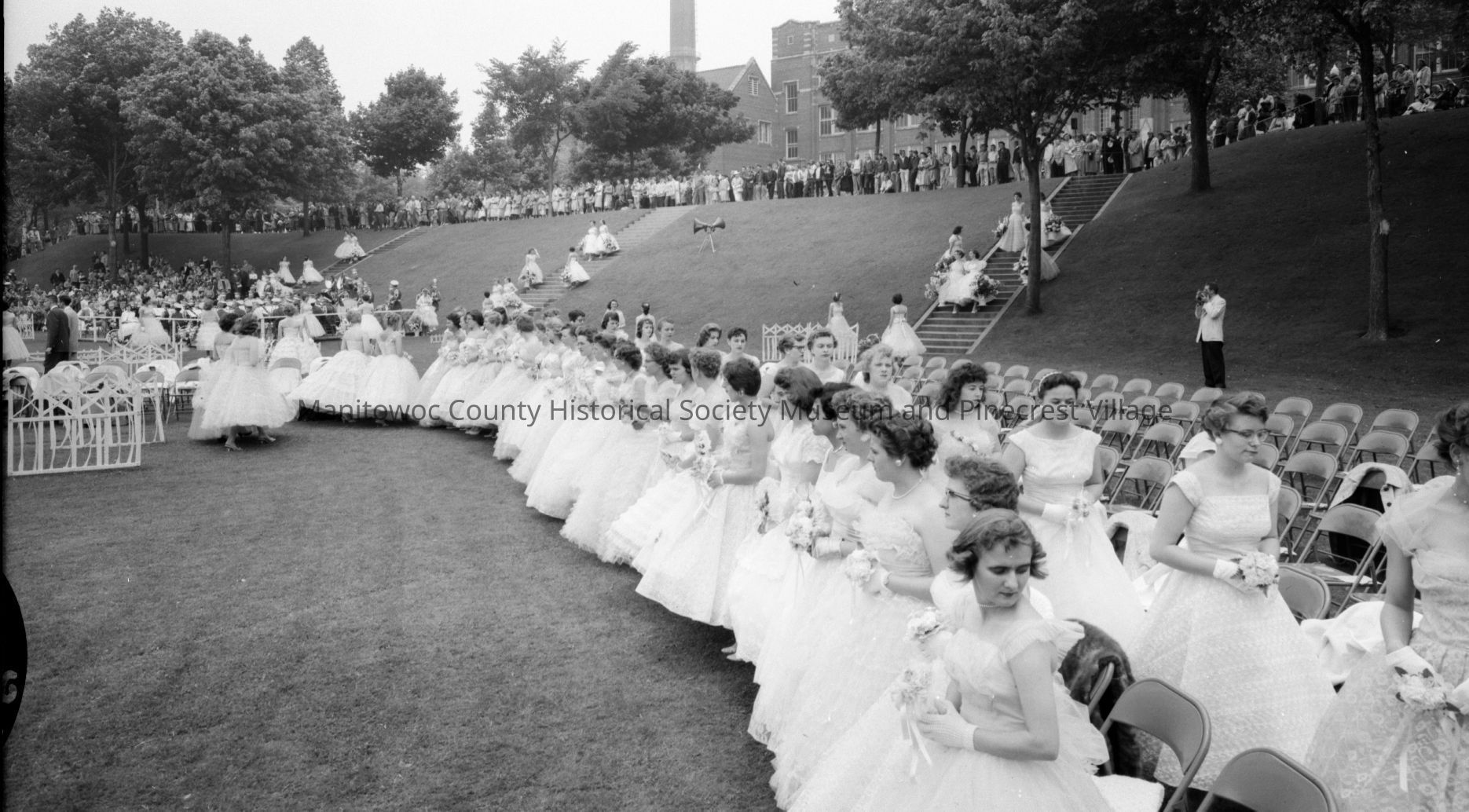 Lincoln High School, South 8th Street Manitowoc, flower girls are collecting their containers and coming down the three stairways as seniors proceed to seats. Photograph taken on June 5th, 1958.Made/Created