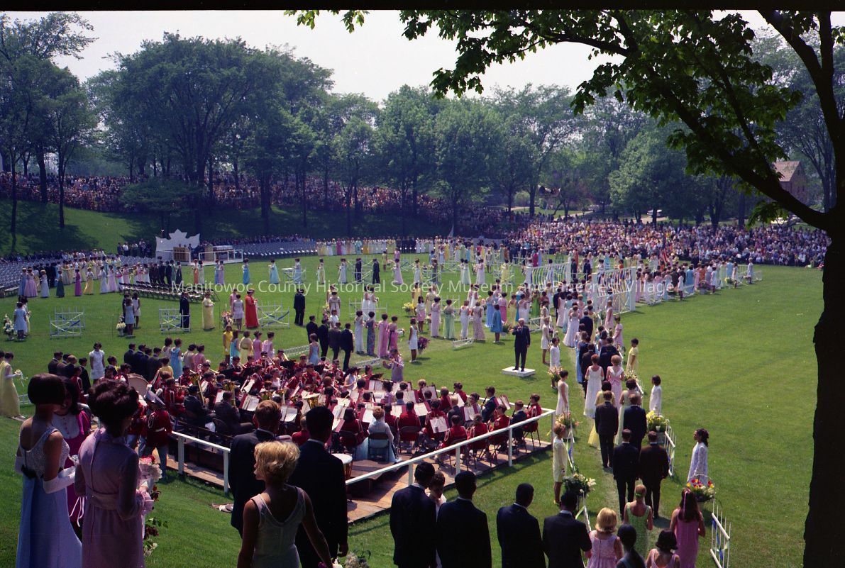 Lincoln High School, South 8th Street Manitowoc, looking down into the bowl from east side at graduation. Photograph taken in June 1968.Made/Created