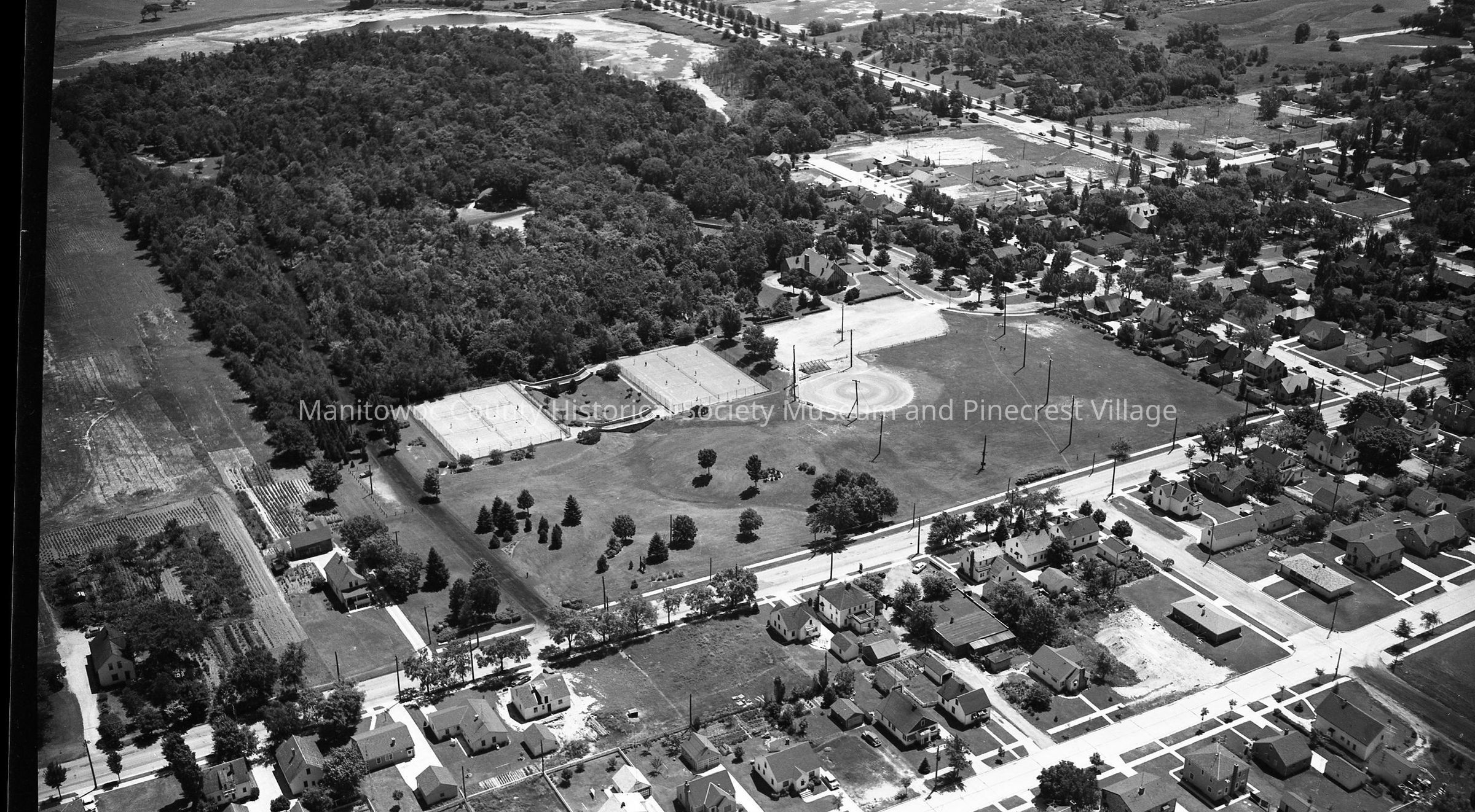 Aerial: Lincoln Park with tennis courts & baseball diamond, Manitowoc. Waldo Blvd is upper right and at bottom is North 9th & North 8th streets. Looking east.