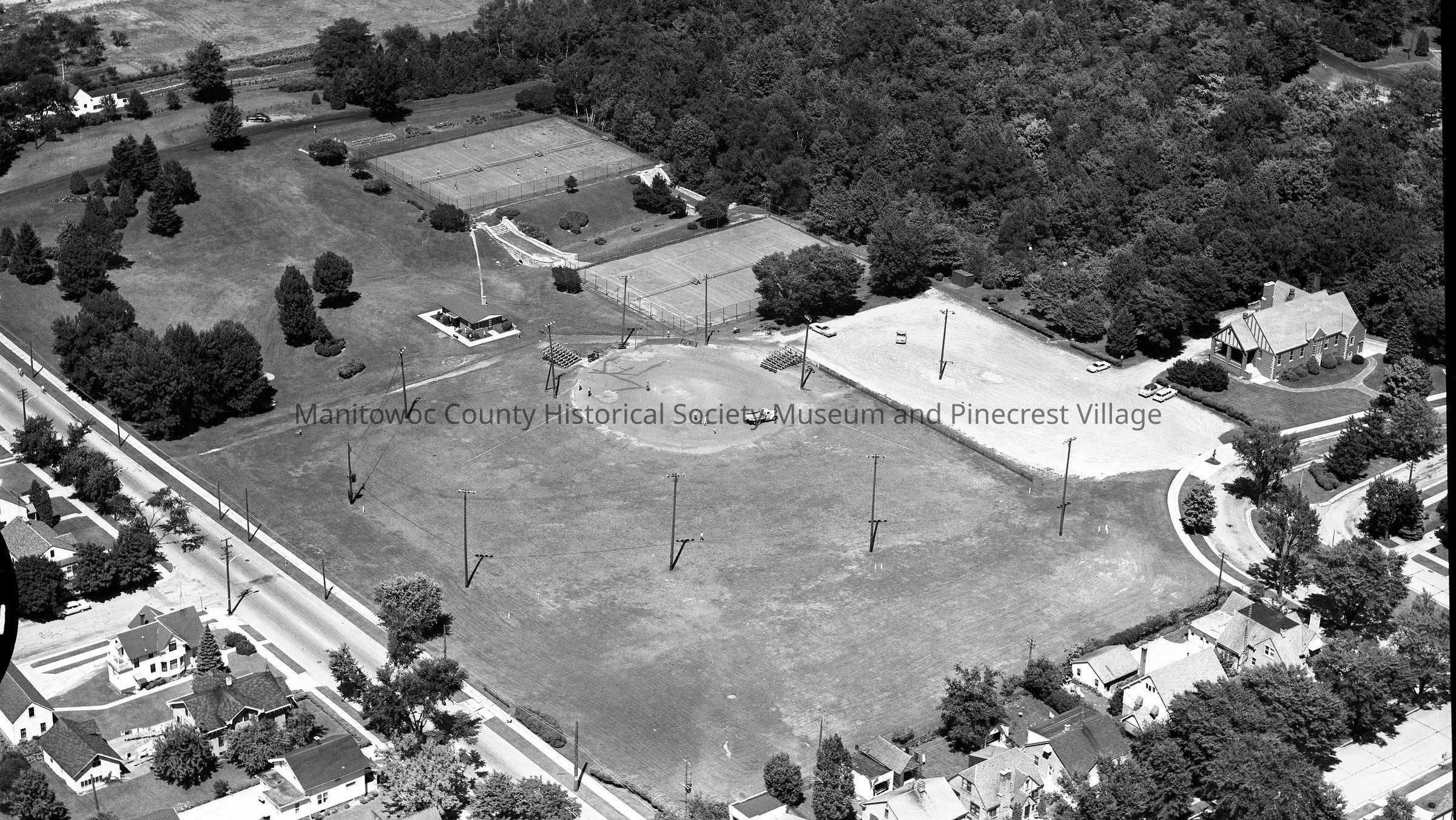 Aerial view of Lincoln Park tennis courts, ball diamond and at right fieldhouse Manitowoc. At left is North 8th Street and bottom corner is Oak Street. Upper left is Kentucky Fried Chicken, 605 and St Paul Methodist Church, 411 Reed Ave. Photograph taken on July 23rd, 1963.Made/Created