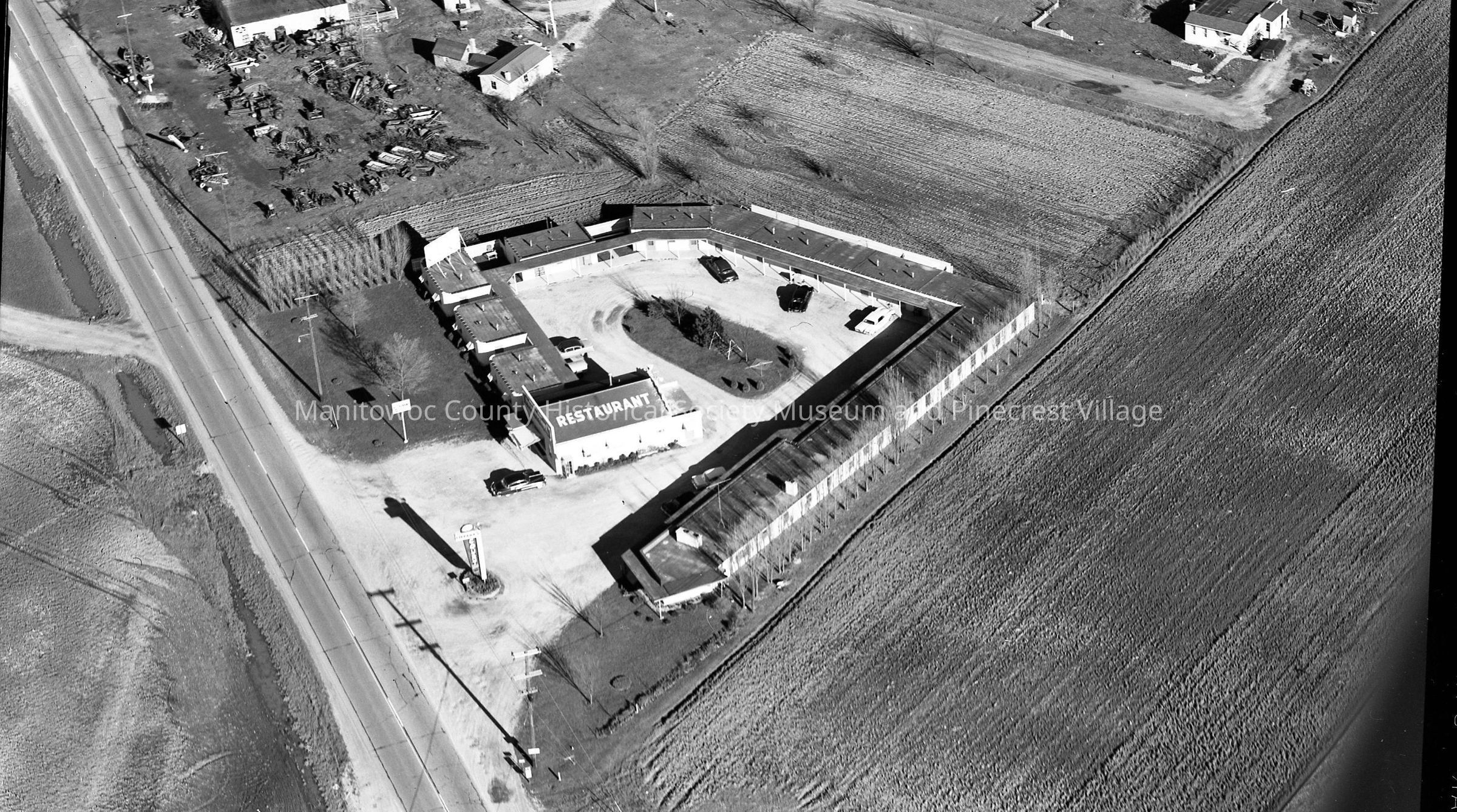 Aerial view of Lippert's Motel & Restaurant, 3949 Calumet Ave Manitowoc. Upper left corner is Lambert-Zinda Implement Company, 3907 Calumet Ave. Photograph taken on November 17th, 1958.Made/Created