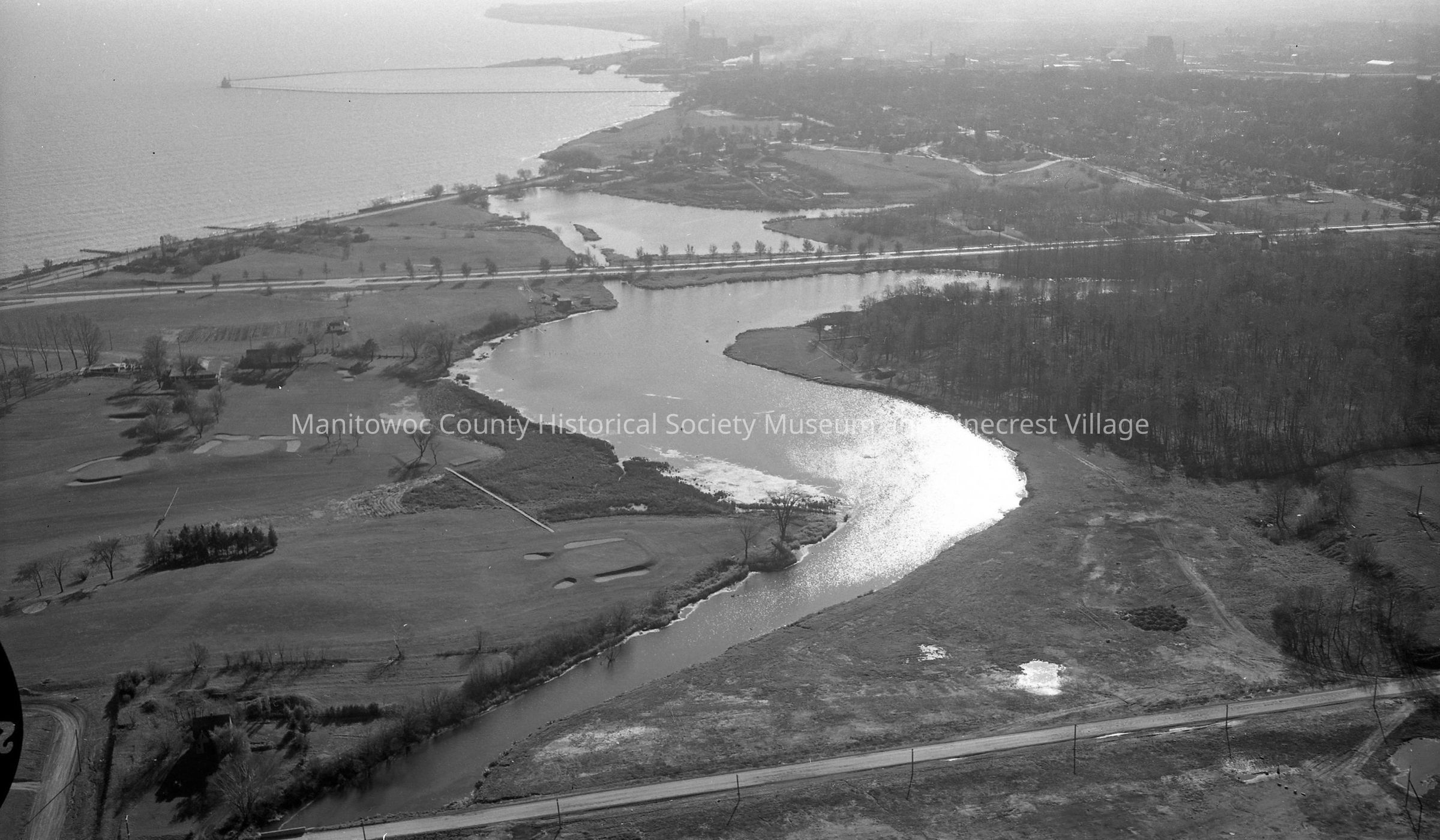 Aerial: Reed Ave & Little Manitowoc River. At right is Lincoln Park and Zoo. At top is Waldo Blvd. Buildings at center left are Lakeside Country Club and golf course.