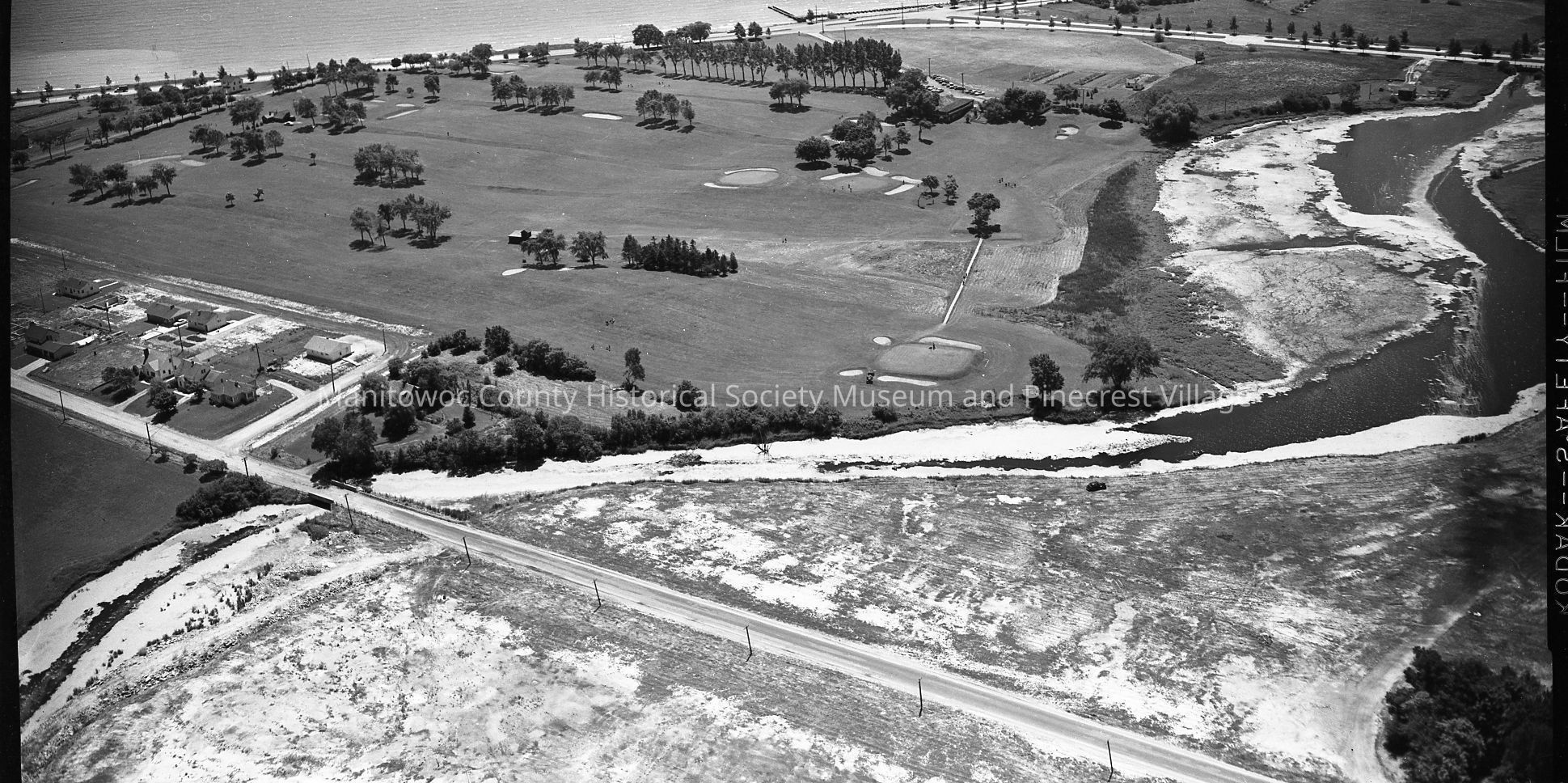 Aerial view of Little Manitowoc river and Reed Ave. Either side of Reed Ave before river are the old city dumps; at top is Waldo Blvd & Memorial Drive. At center is Lakeside Country Club and golf course; later the Elk,s Club.