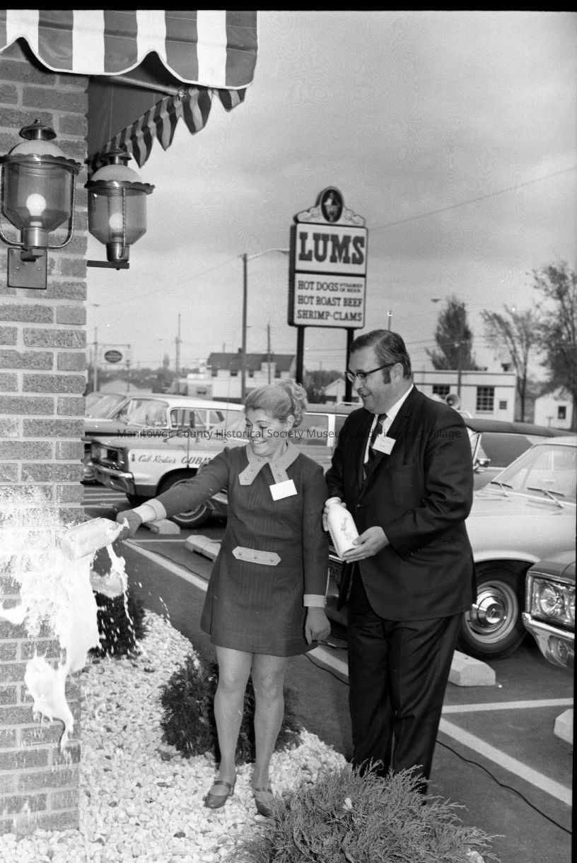 Breaking milk bottle for grand opening of Lum's Restaurant, 3702 Calumet Ave Manitowoc. Photograph taken in 1970.Made/Created