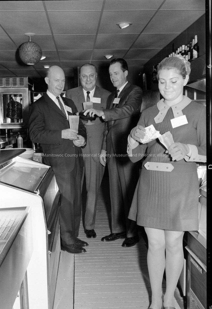 Officials inside Lum's Restaurant grand opening at 3702 Calumet Ave Manitowoc. Photograph taken in 1970.