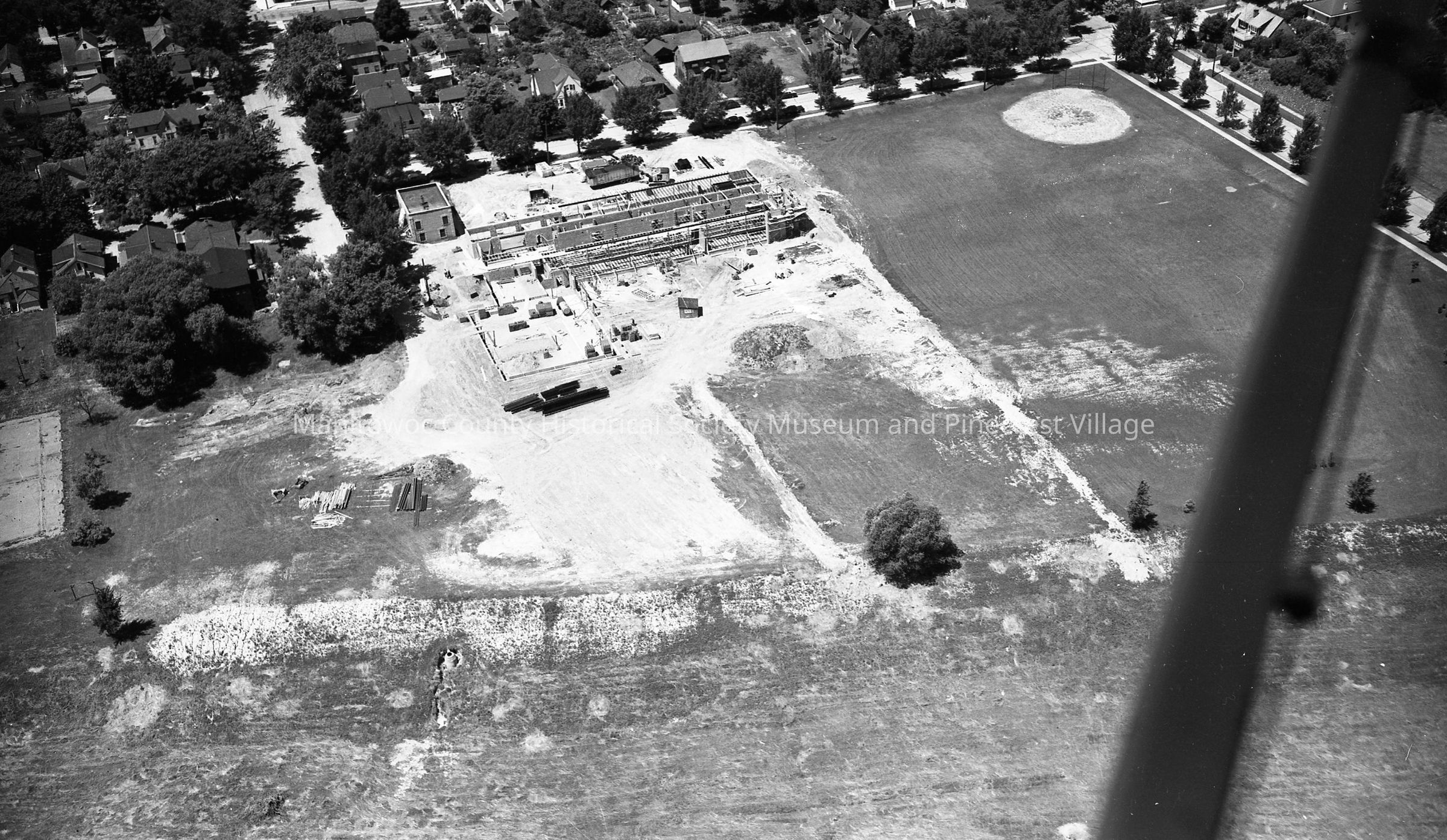 Aerial: Construction of new Madison School, North 4th street & St. Clair Manitowoc. Looking west.
