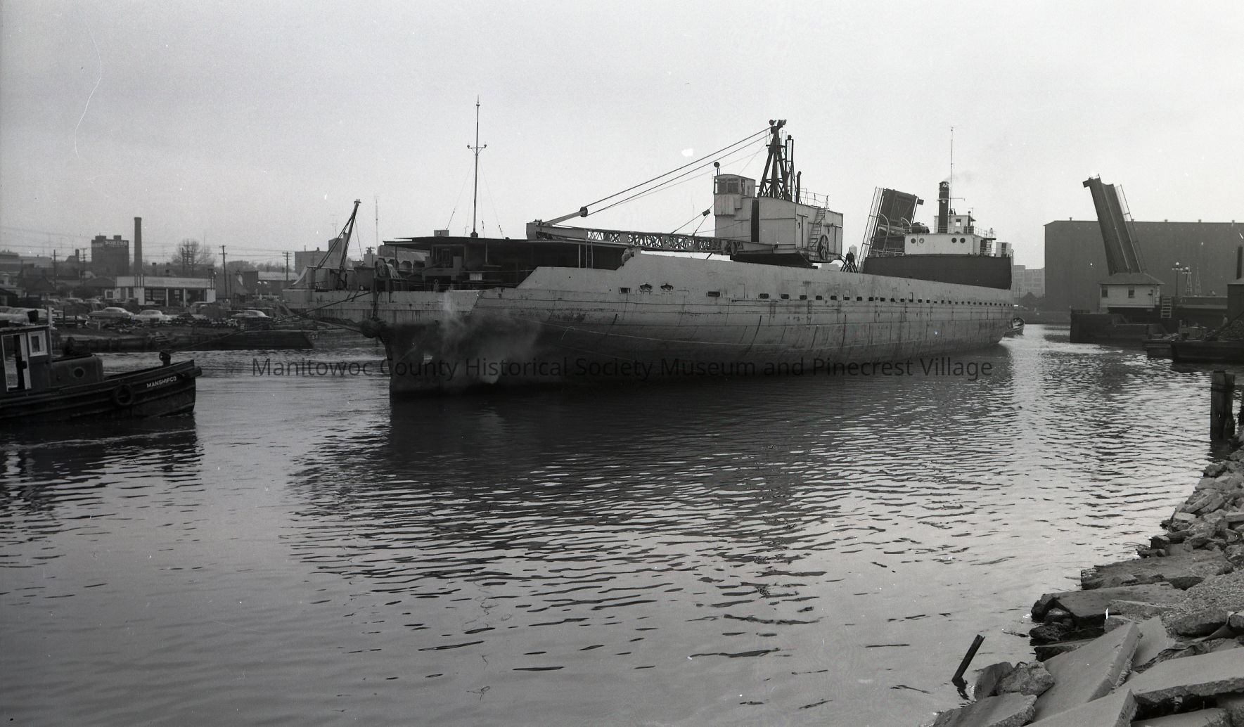 Maitland going upriver through the 10th Street Bridge. She is an old Toronto-Hamilton & Buffalo carferry cut down to a crane barge by the Roen Company in Sturgeon Bay. Photograph taken May 12th, 1955.Made/Created