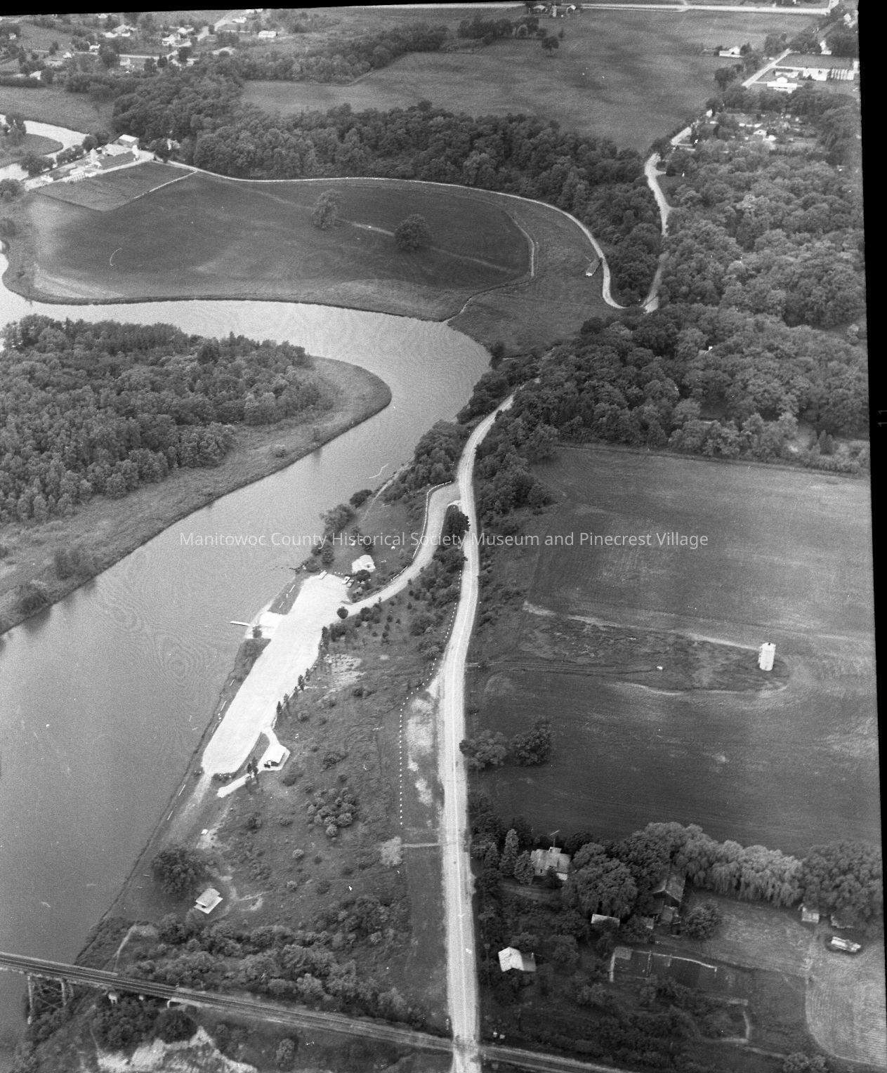 Aerial of Manitou Park along Manitowoc River. Street running bottom to top is Michigan Ave. Rail line at bottom is C&NW mainline to Green Bay. Circa 1960.Made/Created