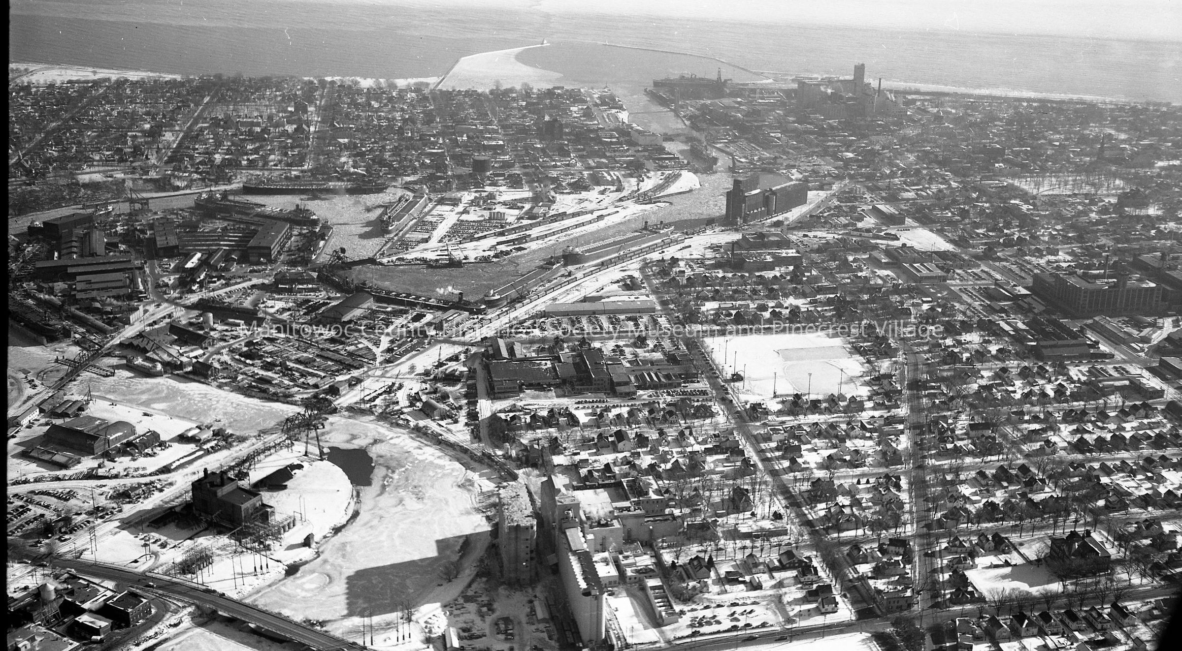 Aerial: Manitowoc looking east from South 21st Street. Open square area center right is West Field ballpark. Center left is Manitowoc Shipbuilding with winter fleet docked.