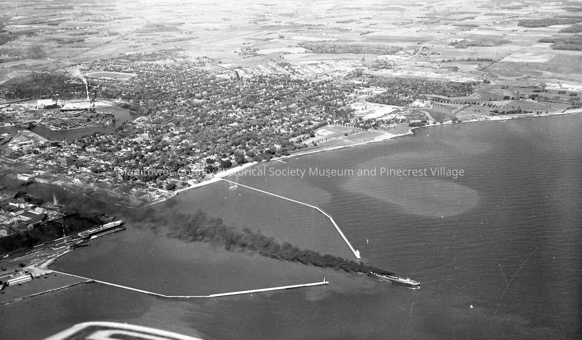 Aerial: Manitowoc lakefront. Ann Arbor #7 carferry is leaving and City of Midland is still loading.